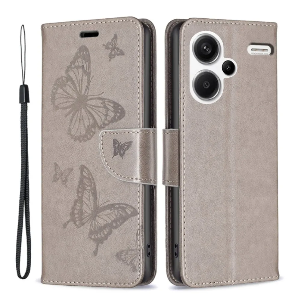 Szürke pénztárca tok Butterfly a Xiaomi Redmi Note 13 Pro+ 5G-hez