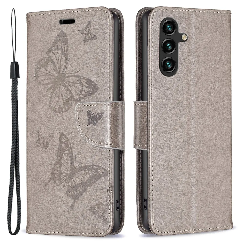 Szürke pénztárca tok Butterfly Samsung Galaxy A35 5G számára