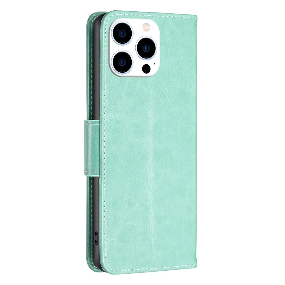 Kék-zöld pillangó pénztárca tok iPhone 16 Pro készülékhez