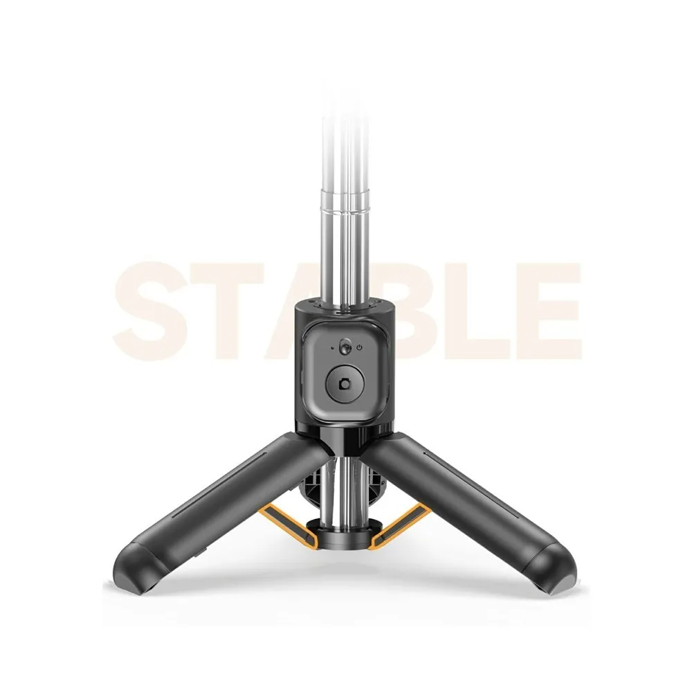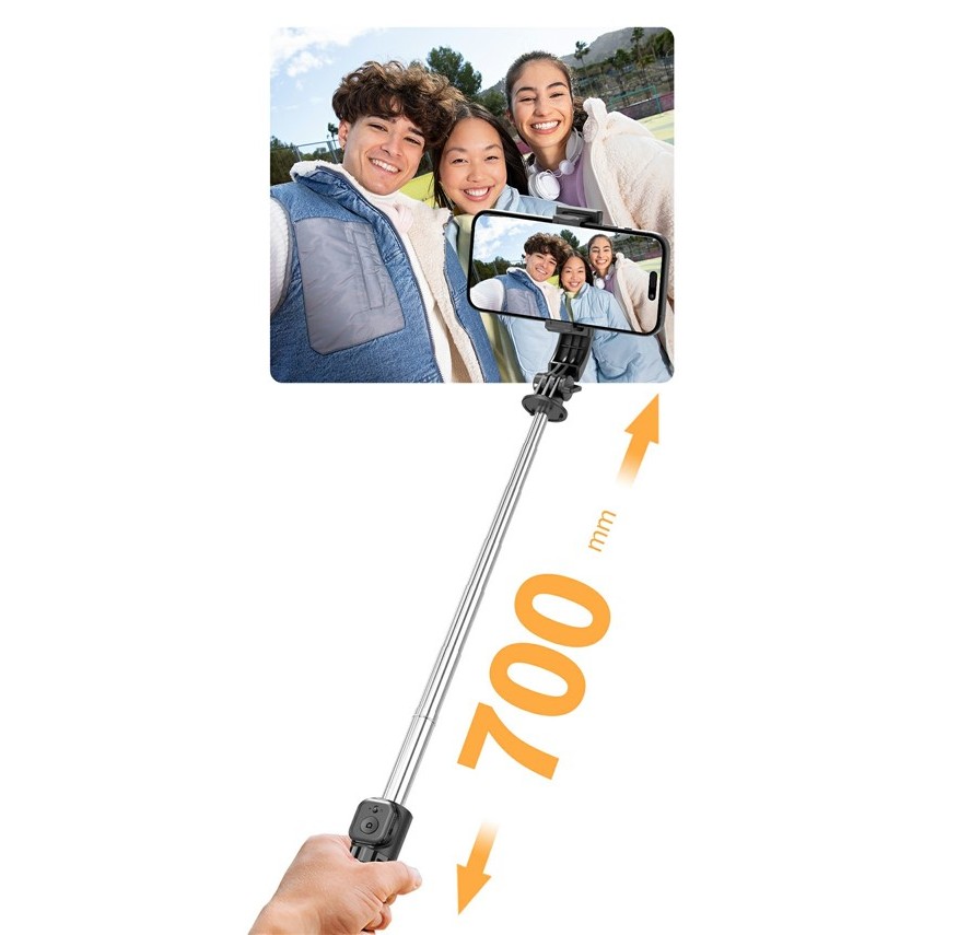 A teleszkópos rúd akár 700 mm magasságig kihúzható, ami elegendő teret biztosít csoportképekhez és szélesebb felvételekhez is. A stabil tripod biztos tartást nyújt asztalon vagy más sík felületen. A csomag része egy levehető Bluetooth távirányító is, amely lehetővé teszi a kamera kényelmes vezérlését akár 10 méteres távolságból.