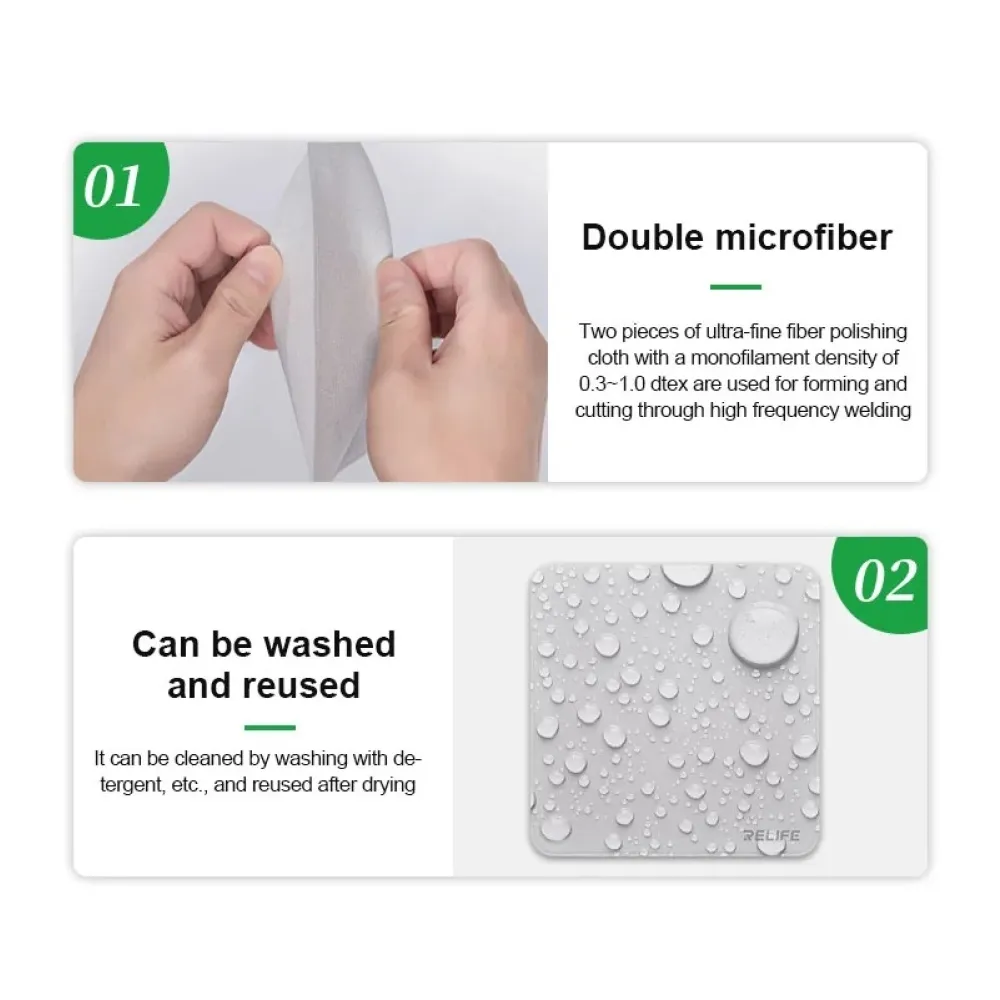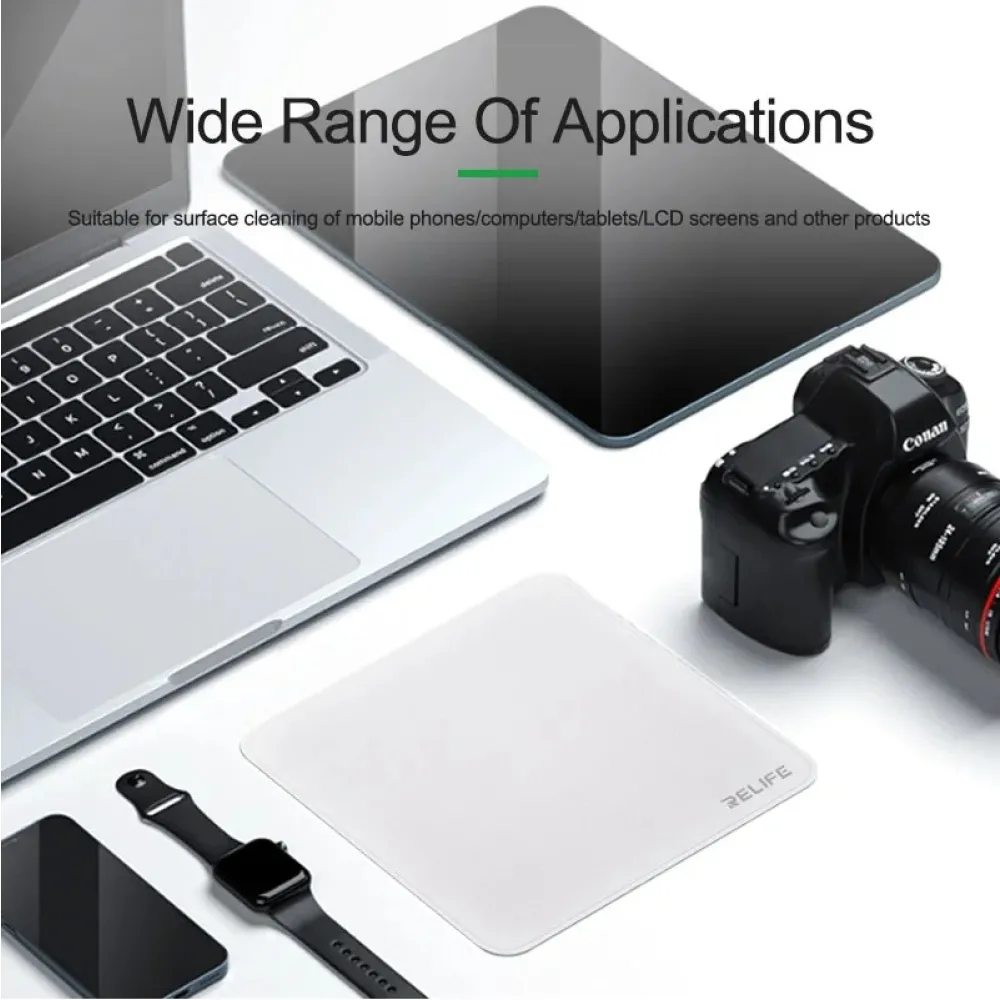 A Relife kétrétegű mikroszálas polírozó kendő egy kiváló minőségű, kétrétegű kendő, amelyet kényes felületek alapos tisztítására és polírozására terveztek. Ideális elektronikus képernyőkhöz, optikai lencsékhez és más érzékeny anyagokhoz, hibátlan felületet biztosítva a karcolás vagy sérülés kockázata nélkül.