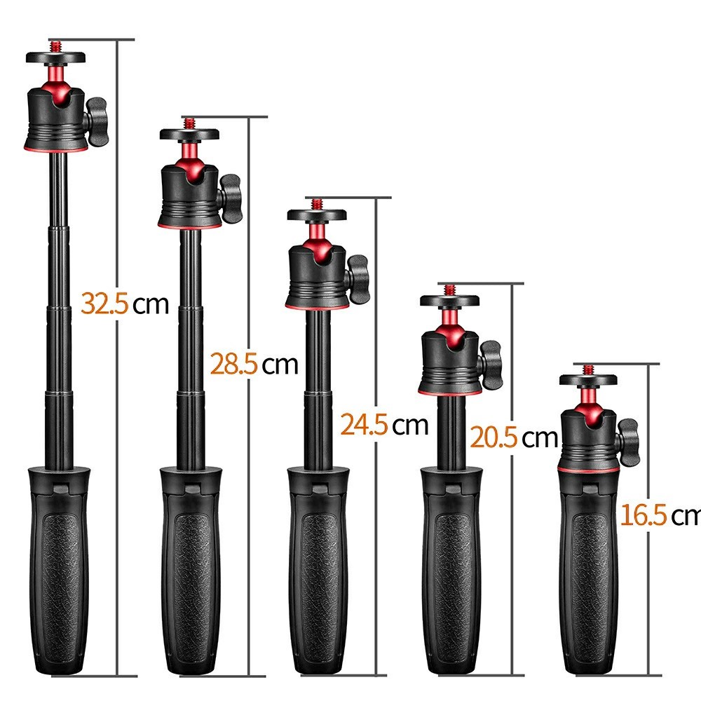 A beépített 1/4" menet lehetővé teszi a legtöbb akciókamera, telefontartó vagy szelfibot csatlakoztatását. Az állvány kihúzható kialakítással rendelkezik, állítható hossza 16,5 és 32,5 cm között.