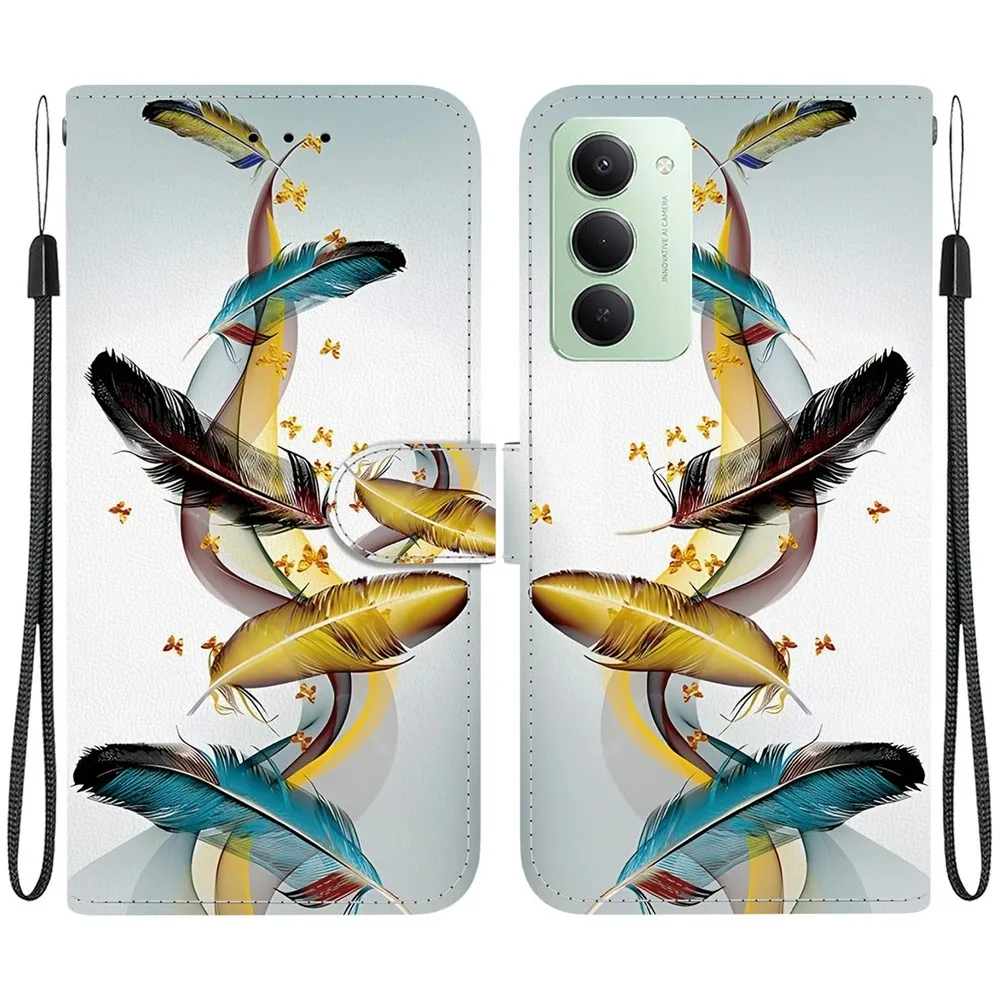 ✅【Kiváló minőségű anyagok】A sokoldalú, arany és kék tollakkal díszített Xiaomi Redmi 15 5G (169mm) tok TPU-val kombinált műbőrből készült, élénk mintázattal