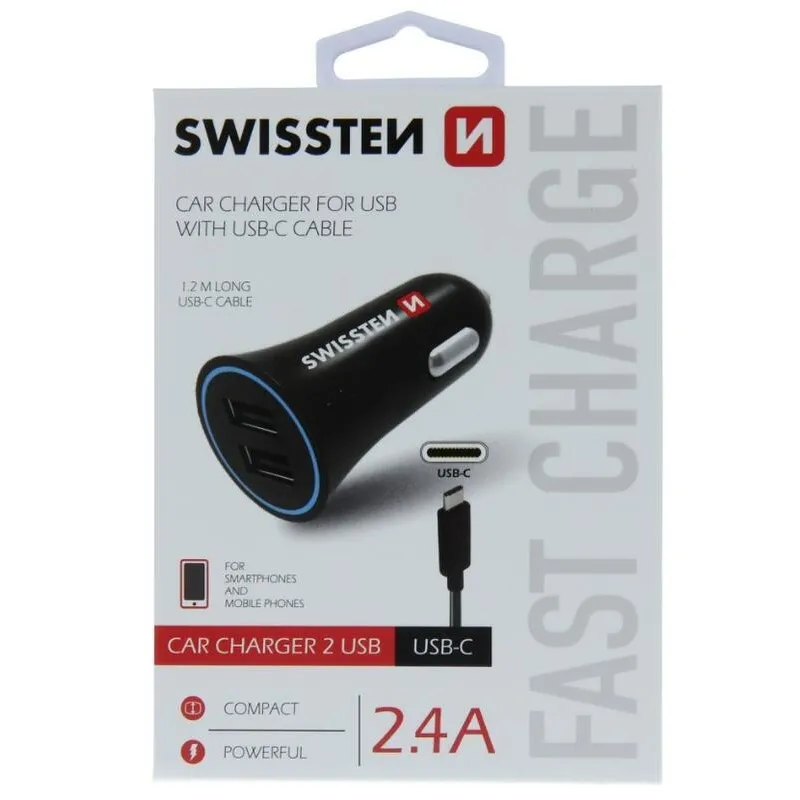 Swissten CL autós töltő adapter 2.4A 2x USB + USB-C kábel - Fekete