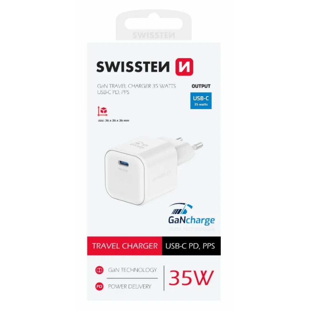 Swissten GaN 1x USB-C 35W teljesítményű töltő - fehér
