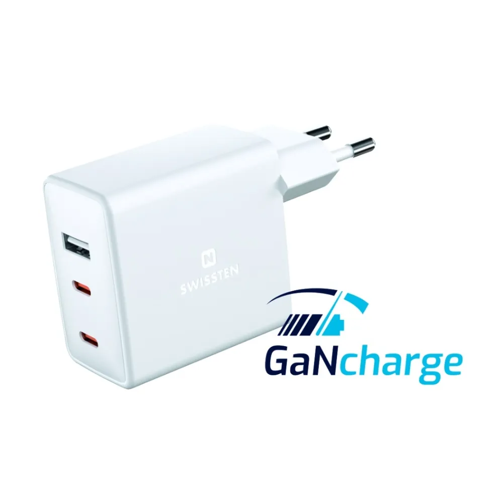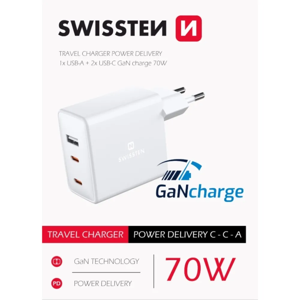 Swissten GaN 70W-os töltő, 2x USB-C, 1x USB - fehér