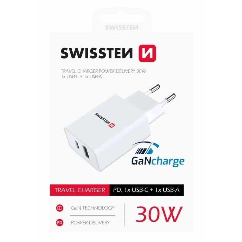Swissten GaN hálózati adapter 1x USB-C + 1x USB 30W - fehér