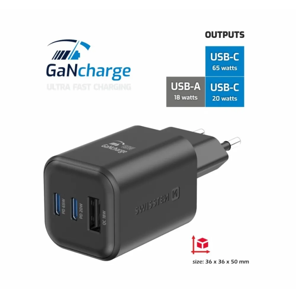 Swissten GaN töltő 2x USB-C 65W PD + 1x USB-A 18W QC - fekete