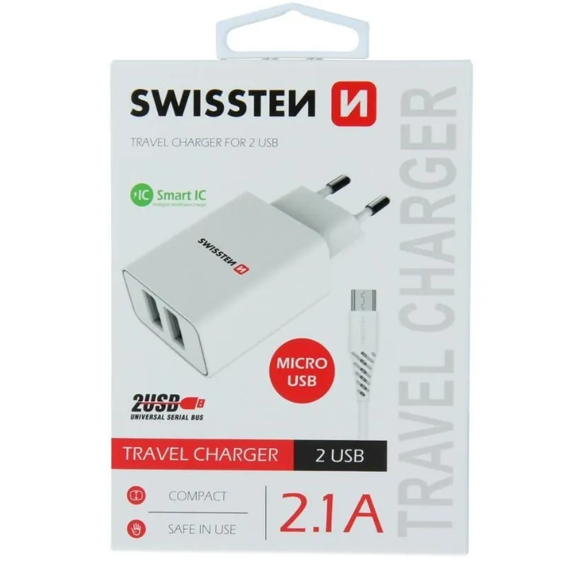 Swissten hálózati adapter, 2x USB, 2.1A + micro USB kábel 1.2m - fehér