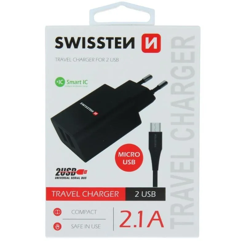 Swissten hálózati adapter, 2x USB, 2.1A + micro USB kábel 1.2m - fekete