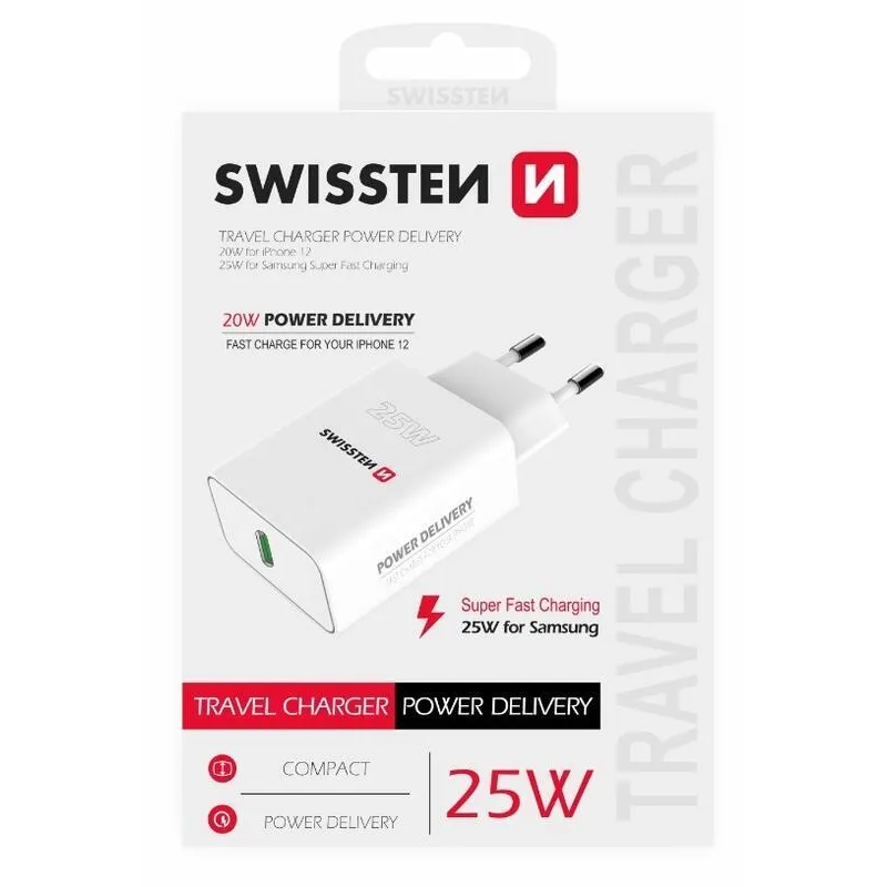 Swissten hálózati adapter PD 25W iPhone és Samsung készülékhez - Fehér színben