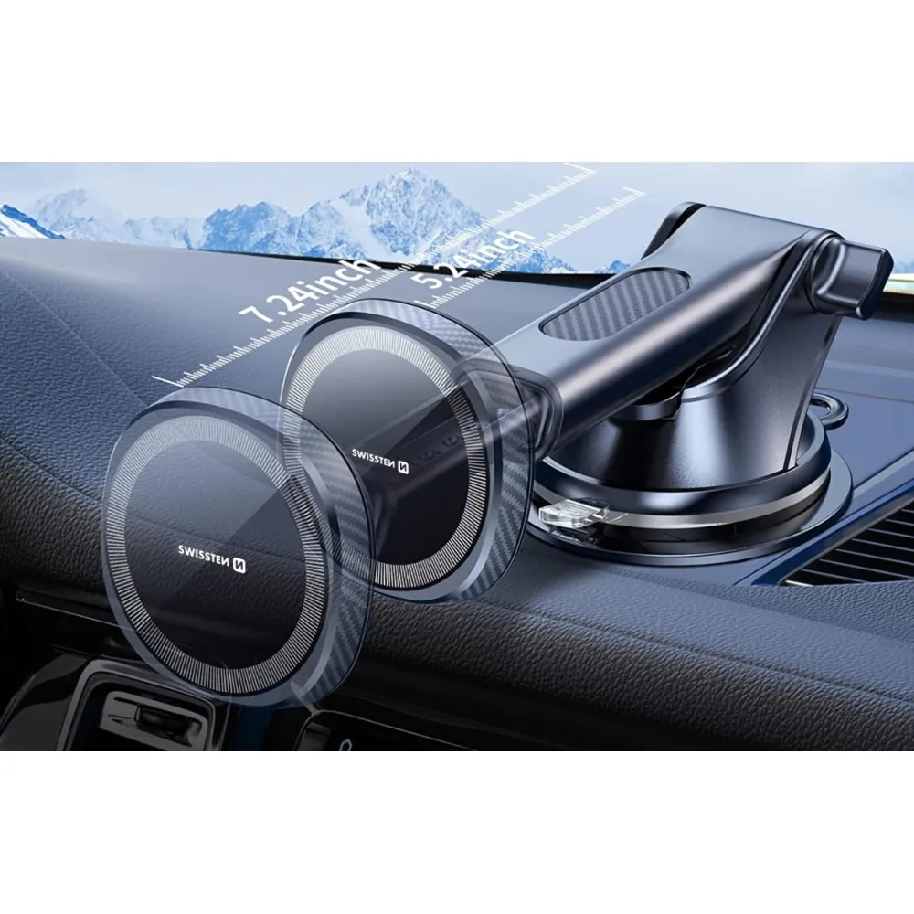 Swissten mágneses műszerfali tartó 15W-os vezeték nélküli töltéssel és MagSafe-rel