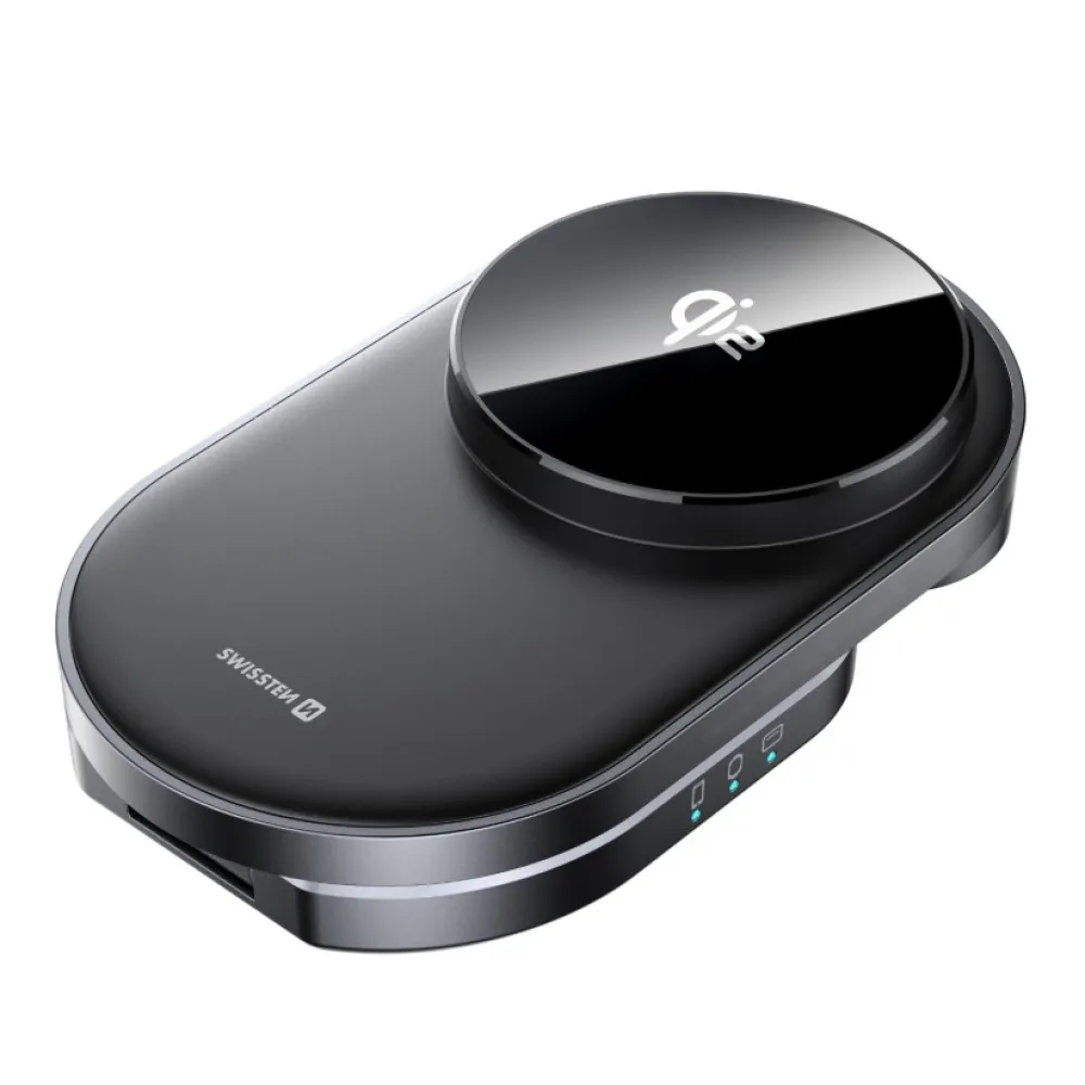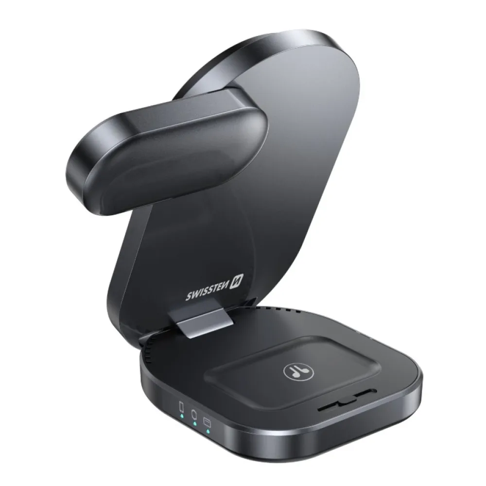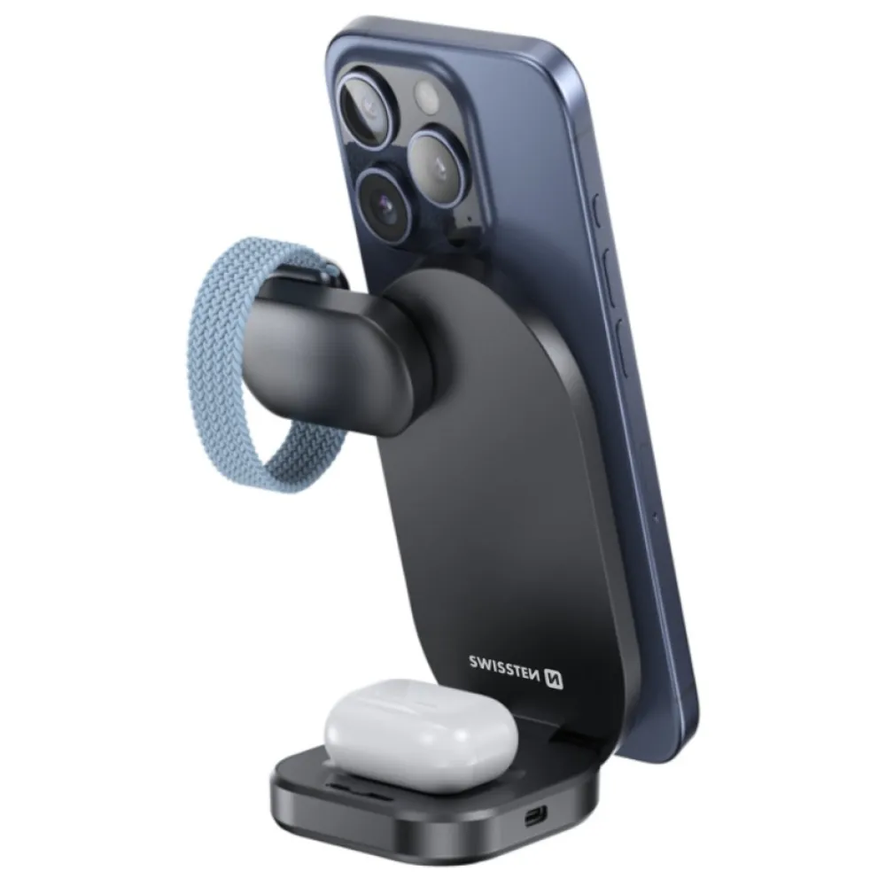 Swissten összecsukható vezeték nélküli Qi2 MagBase 3in1 töltő - fekete (MagSafe kompatibilis)