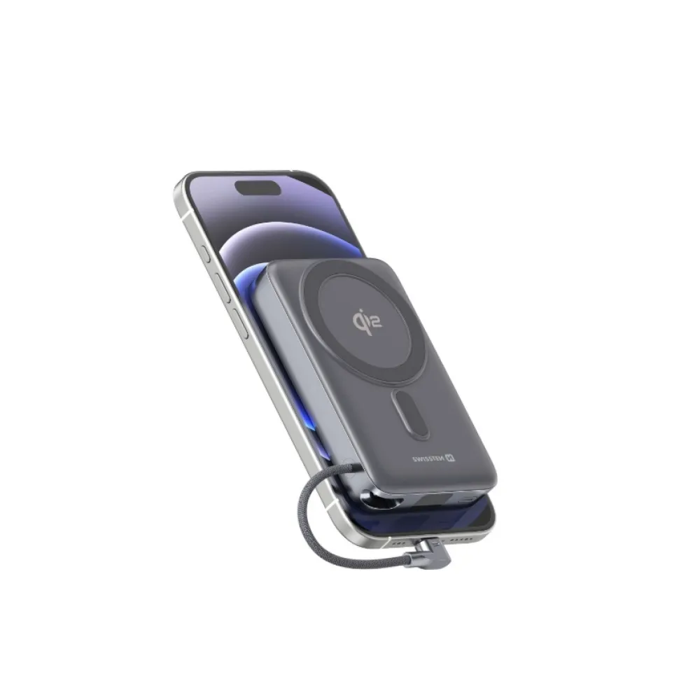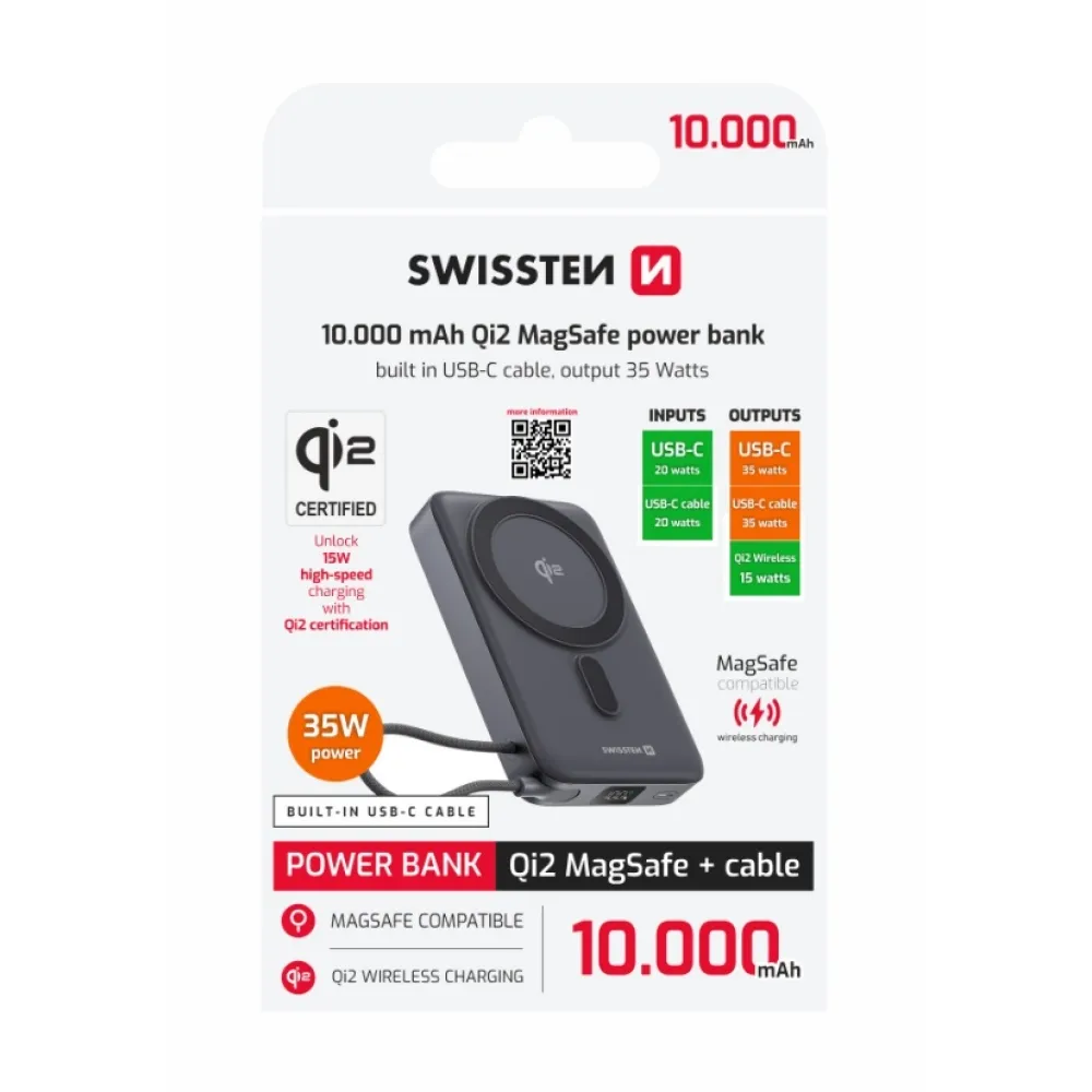 A kompakt és nagy teljesítményű SWISSTEN Qi2 MagSafe powerbank csúcstechnológiát kínál a gyors és kényelmes töltéshez. Az új Qi2 szabványnak és akár 35 W kimeneti teljesítménynek köszönhetően nemcsak okostelefonokat, hanem nagyobb energiaigényű eszközöket, például tableteket vagy laptopokat is könnyedén ellát energiával. Ideális megoldás utazáshoz, irodába és mindennapi használatra. Qi2 vezeték nélküli töltés akár 15 W teljesítménnyel Az új Qi2 szabvány gyorsabb, biztonságosabb és hatékonyabb vezeték nélküli töltést kínál, mint a korábbi generációk. Az Android okostelefonok és a MagSafe kompatibilis iPhone készülékek akár 15 W teljesítménnyel tölthetők – kábel nélkül, gyorsan és megbízhatóan. A töltés stabil mozgás közben is, és kíméli az akkumulátort. Gyors töltés akár 35 W USB-C porton keresztül A powerbank támogatja a legújabb PowerDelivery és PPS protokollokat, így akár 35 W teljesítményt biztosít. Rövid idő alatt feltöltheti az olyan eszközöket is, mint az iPad, MacBook vagy a Samsung Galaxy készülékek. Beépített USB-C kábel és kihajtható állvány A powerbank testébe integrált praktikus 15 cm-es USB-C kábel azonnal használatra kész. A kihajtható állvány pedig kényelmes képernyőnézést tesz lehetővé töltés közben.
