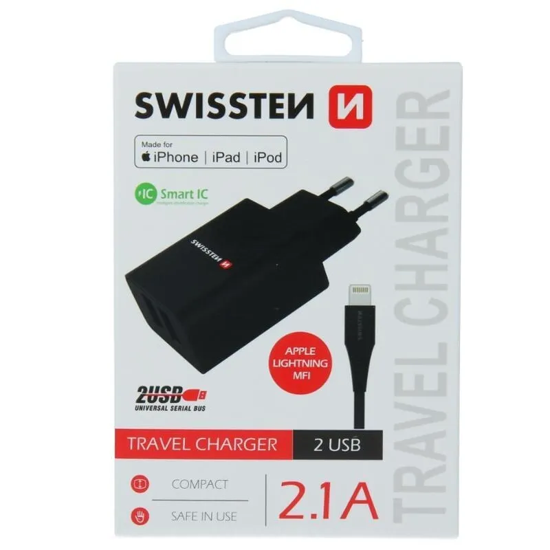 Swissten SMART IC 2.1A 2x USB + USB/Lightning MFI 1.2m kábel - fekete