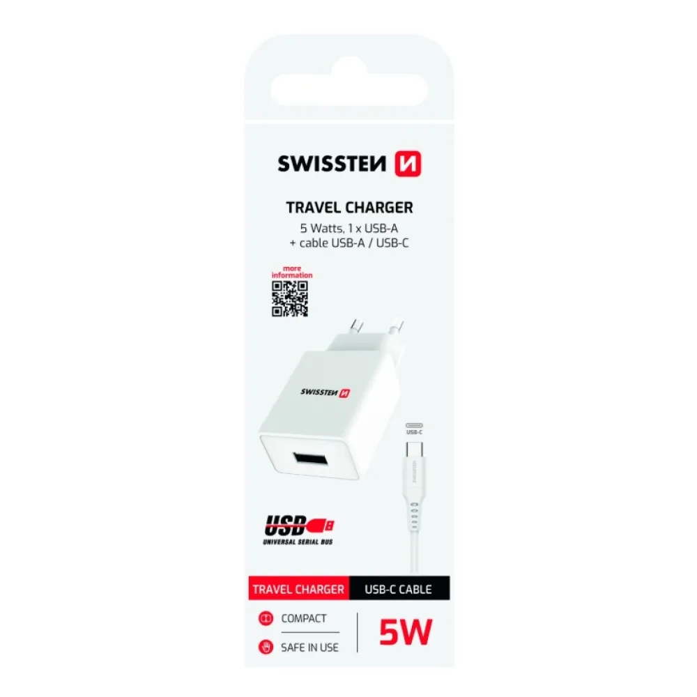 Swissten Smart IC töltő 1x USB 1A + USB/Type-C kábel 1.2m - fehér