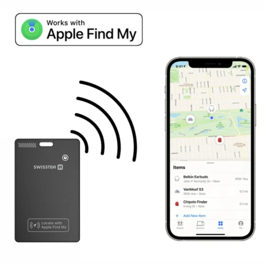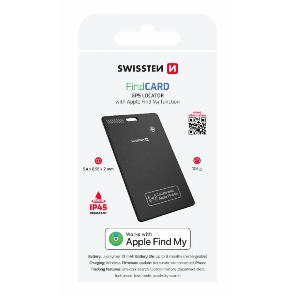A SWISSTEN Find Card egy ultravékony okos helymeghatározó hitelkártya formátumban, amely segít könnyedén megtalálni pénztárcáját, iratait, útlevelét vagy más értékeit. Az Apple Find My hálózatba való integrációnak köszönhetően közvetlenül együttműködik iPhone-nal és iPaddel, további alkalmazások telepítése nélkül. Egyszerűen helyezze a pénztárcába vagy tokba, és elvesztés esetén könnyedén megtalálhatja a Find My alkalmazás segítségével – bárhol a világon.