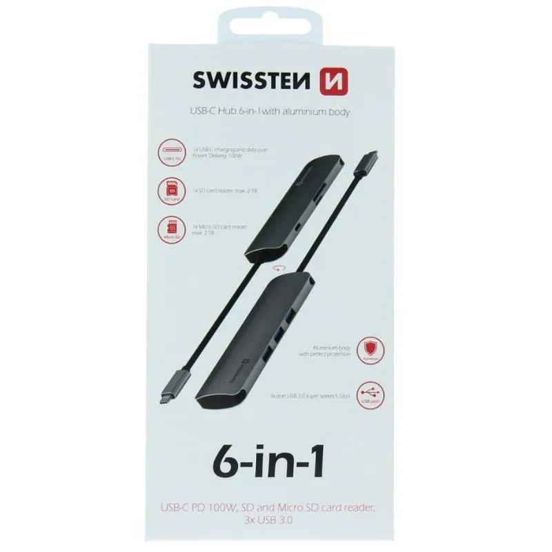 Swissten USB-C HUB 6in1 (USB-C PD, 3x USB 3.0, SD, MICRO SD) - Alumínium