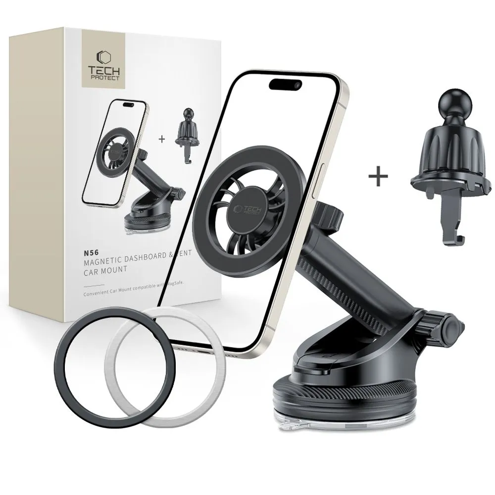 Tech-Protect N56 egy univerzális autós tartó MagSafe támogatással, amely gyors és kényelmes telefonrögzítést biztosít felesleges kezelés nélkül. Az erős mágneseknek köszönhetően elég a készüléket közelíteni, és a tartó azonnal a megfelelő pozícióban rögzíti, ami ideális a mindennapi használat során vezetés közben.