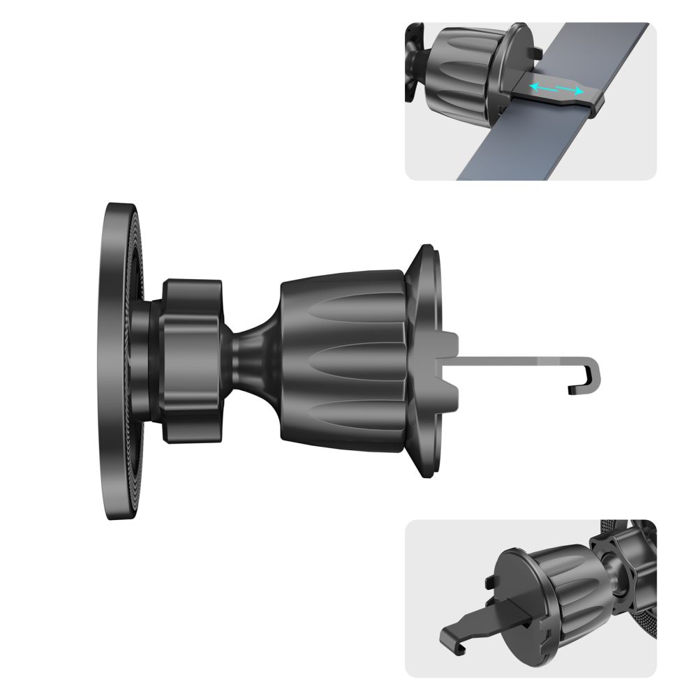A 360°-ban forgatható fej segítségével könnyedén beállítható az ideális szög navigációhoz, hívásokhoz vagy értesítések megtekintéséhez. A tartó sokoldalúan használható, mivel rögzíthető a műszerfalra, a szélvédőre vagy a szellőzőrácsba is. A sima felületeken a stabilitást erős tapadókorong biztosítja rögzítő mechanizmussal, míg a kampós adapter stabilan tart a szellőzőrácsban.