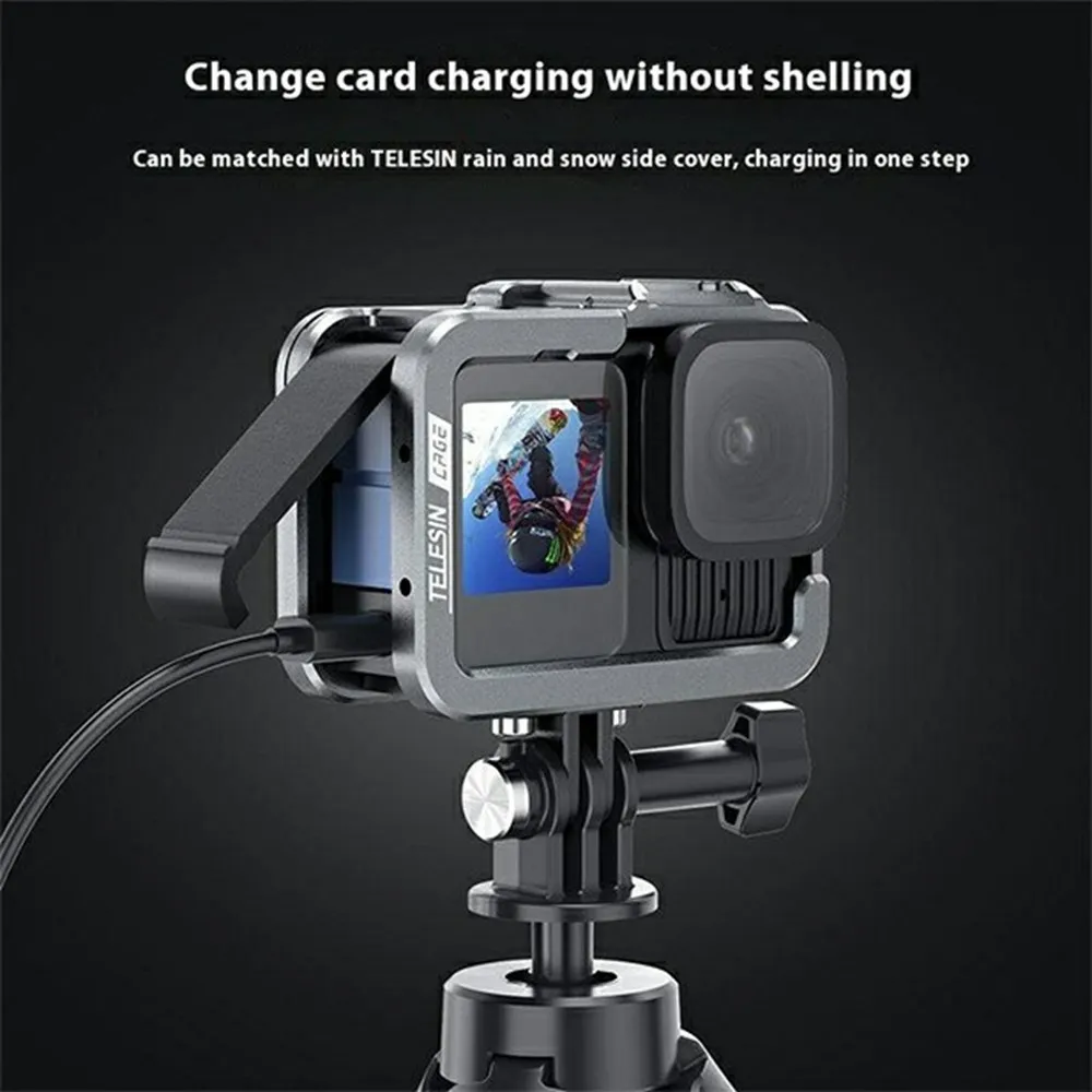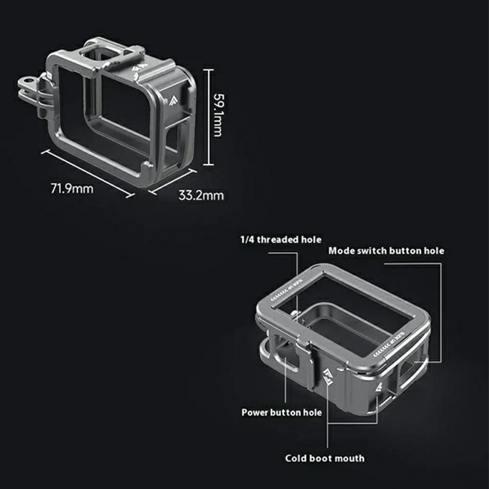 Az oldalsó nyílások lehetővé teszik az akkumulátor és az USB-C töltőcsatlakozó elérését a keret eltávolítása nélkül. Az alsó és oldalsó rögzítési pontok támogatják további kiegészítők, például tartók, állványok vagy lámpák csatlakoztatását. A tartós fém kialakítás növeli a kamera élettartamát gyakori használat mellett.