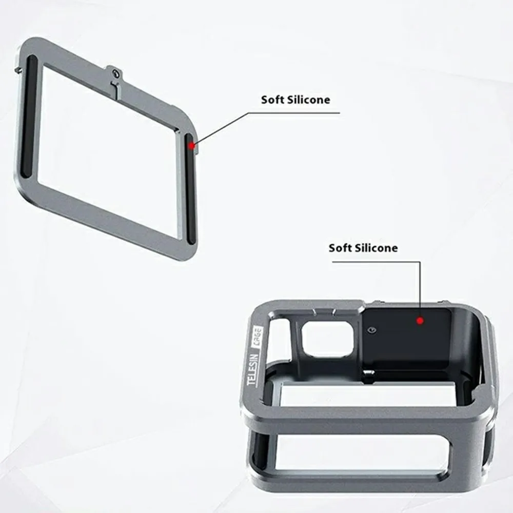 TELESIN 6-FMS-14-TGP fém védőkeret GoPro Hero 13/12/11 kamerákhoz, vertikális rögzítési lehetőséggel strapabíró kiegészítő, amely maximális védelmet biztosít sportolás és intenzív felvételkészítés során. A masszív fém konstrukció megvédi a kamera házát az ütődésektől, esésektől és karcolásoktól anélkül, hogy korlátozná a gombokhoz, kijelzőhöz vagy csatlakozókhoz való hozzáférést.