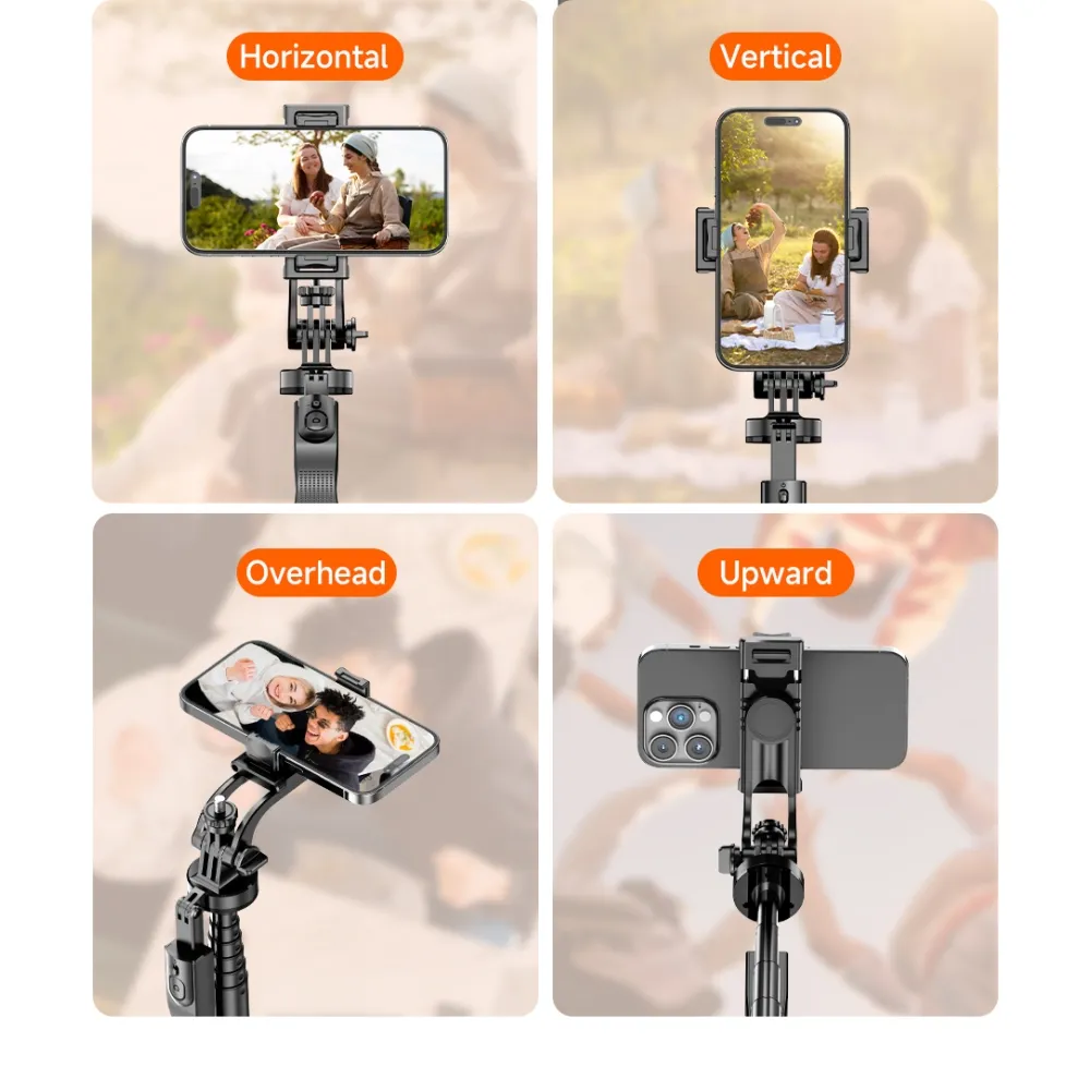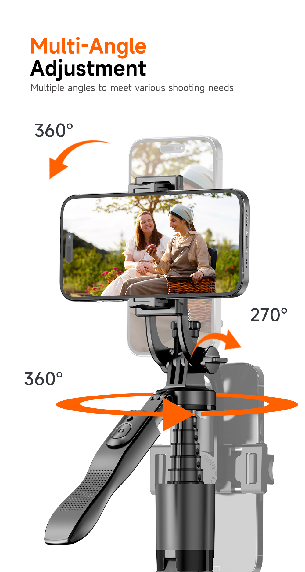 A bot többféle szögbeállítást és teljes rugalmasságot kínál felvétel közben. A telefontartó 360°-ban forgatható, a csuklórész akár 270°-ban dönthető, az alap pedig 360°-os elforgatást tesz lehetővé. Alkalmas vízszintes és függőleges rögzítéshez.
