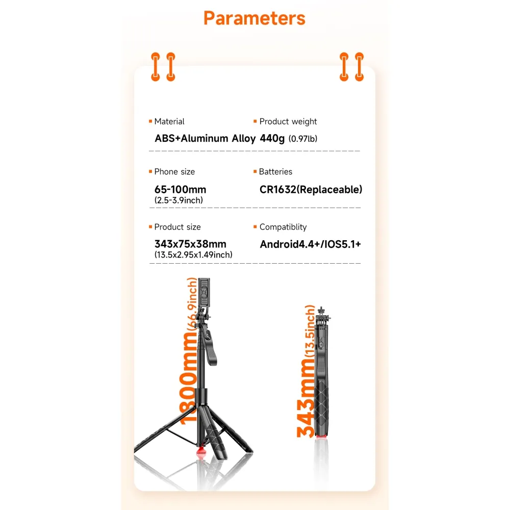 Modell: L16-TT Anyag: ABS műanyag + alumínium ötvözet Termék súlya: 440 g Maximális magasság: 180 cm Összecsukott hossz: 343 mm Összecsukott méret: 343 × 75 × 38 mm Telefontartó tartomány: 65–100 mm (2,5–3,9") Csatlakozó: szabványos 1/4" menet Távirányító elem típusa: CR1632, cserélhető Rendszer kompatibilitás: Android 4.4 és újabb / iOS 5.1 és újabb Szín: fekete