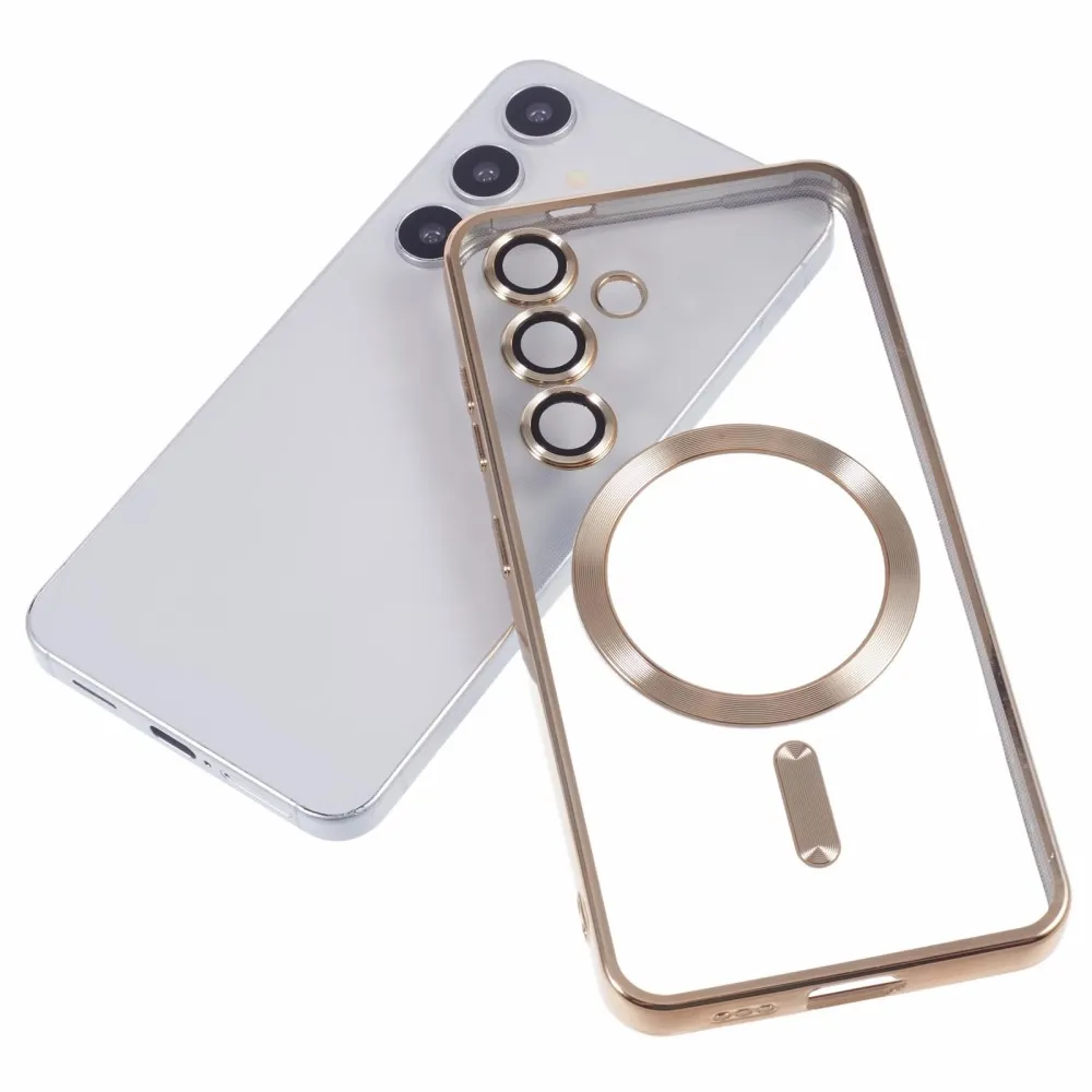 Arany színű, átlátszó borítás kameravédelemmel és MagSafe támogatással Samsung Galaxy S25+ készülékhez