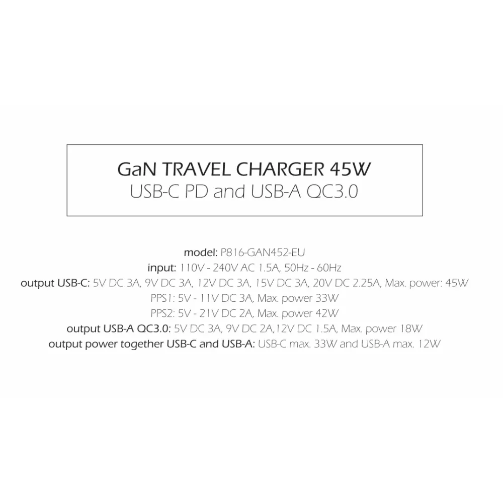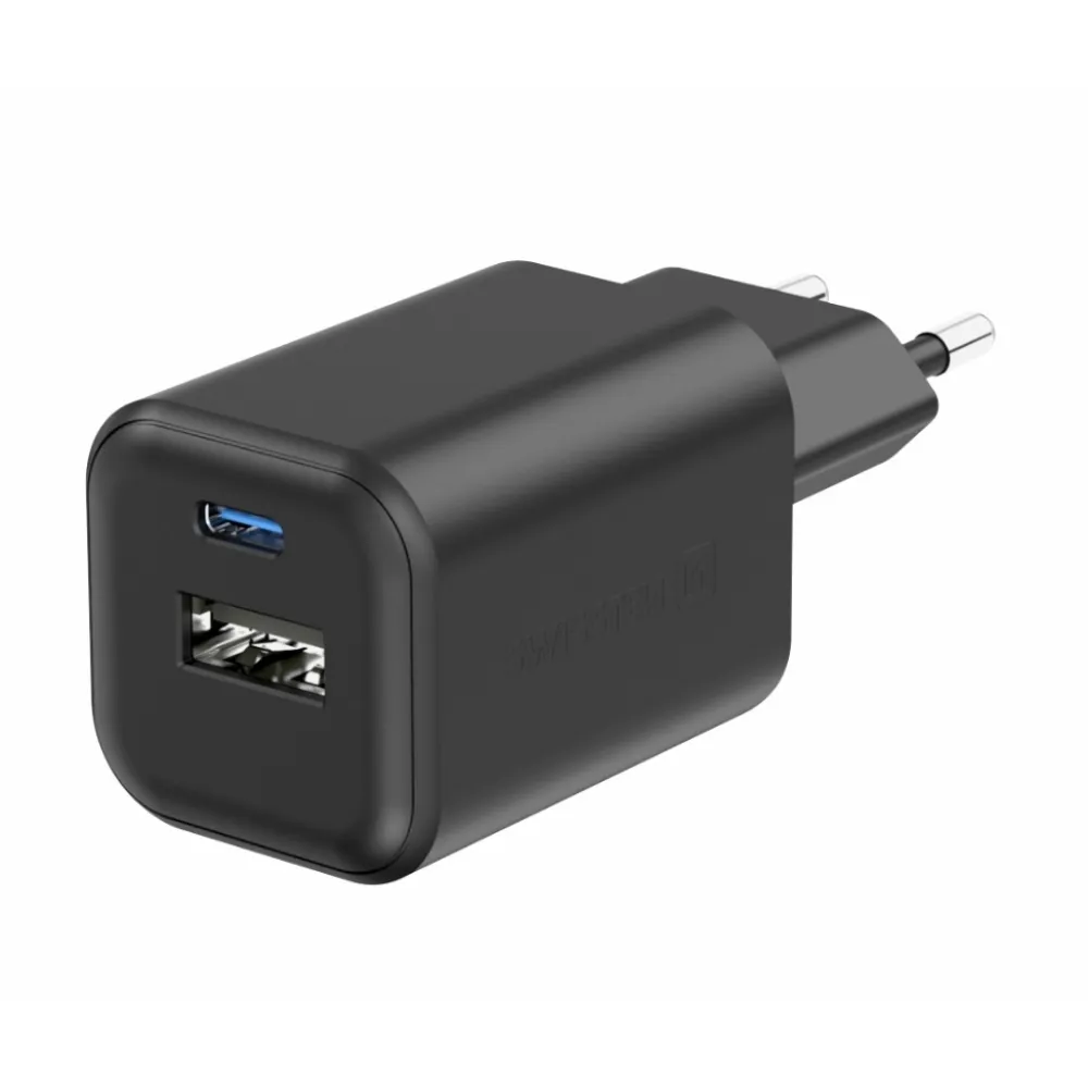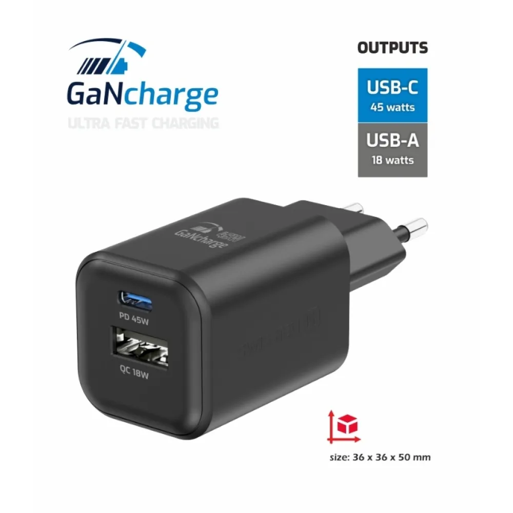 Töltő Swissten GaN 1x USB-C 45W PD + 1x USB-A 18W QC - fekete