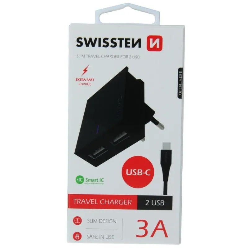 Töltő Swissten SMART IC 3A 3A 2x USB + USB/Type C kábel 1,2m - fekete
