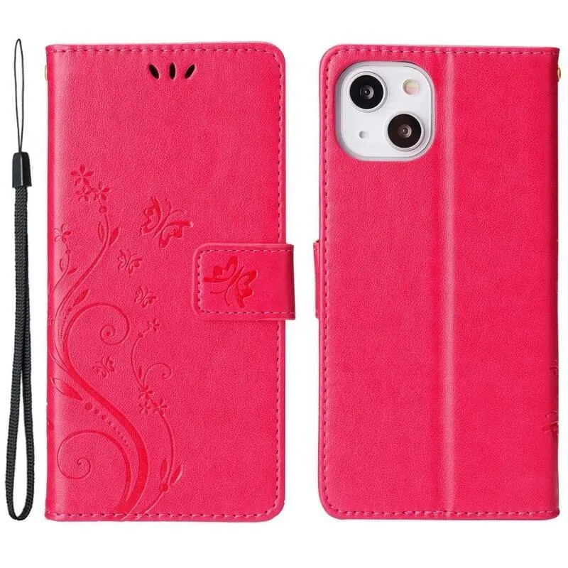 Virág PU bőr pénztárca tok iPhone 14 6.1 készülékhez - piros