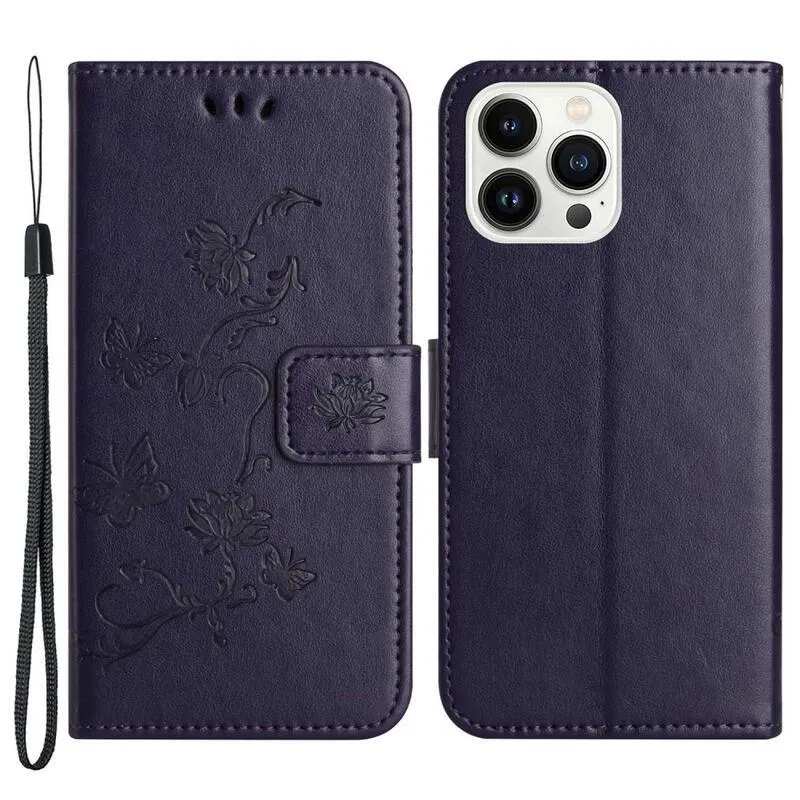 Virág sötét lila pénztárca tok iPhone 14 Pro Max 6.7 számára