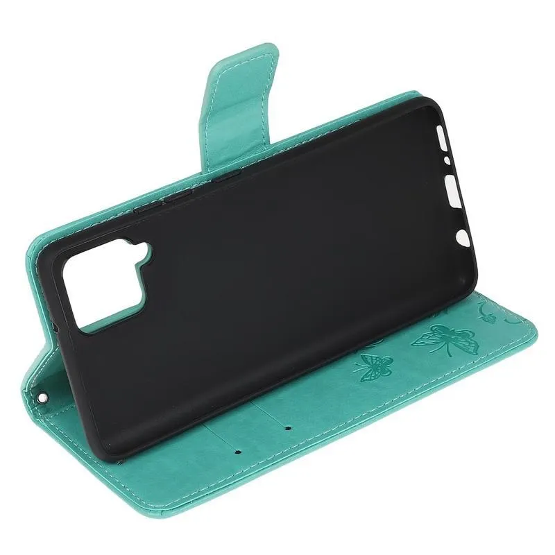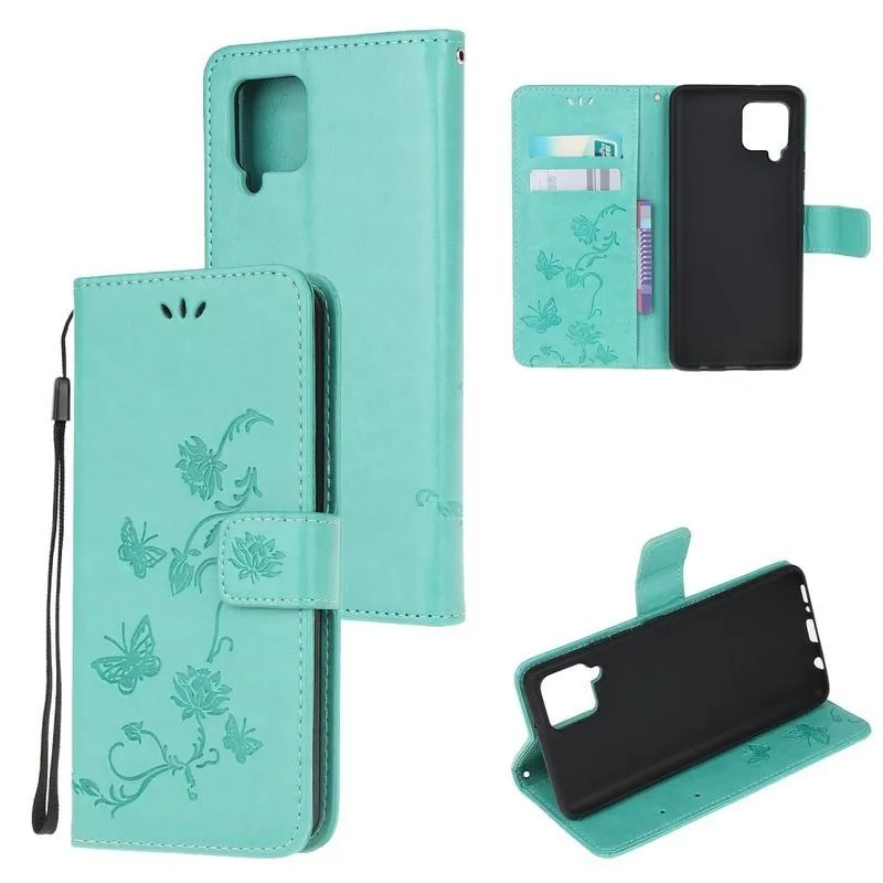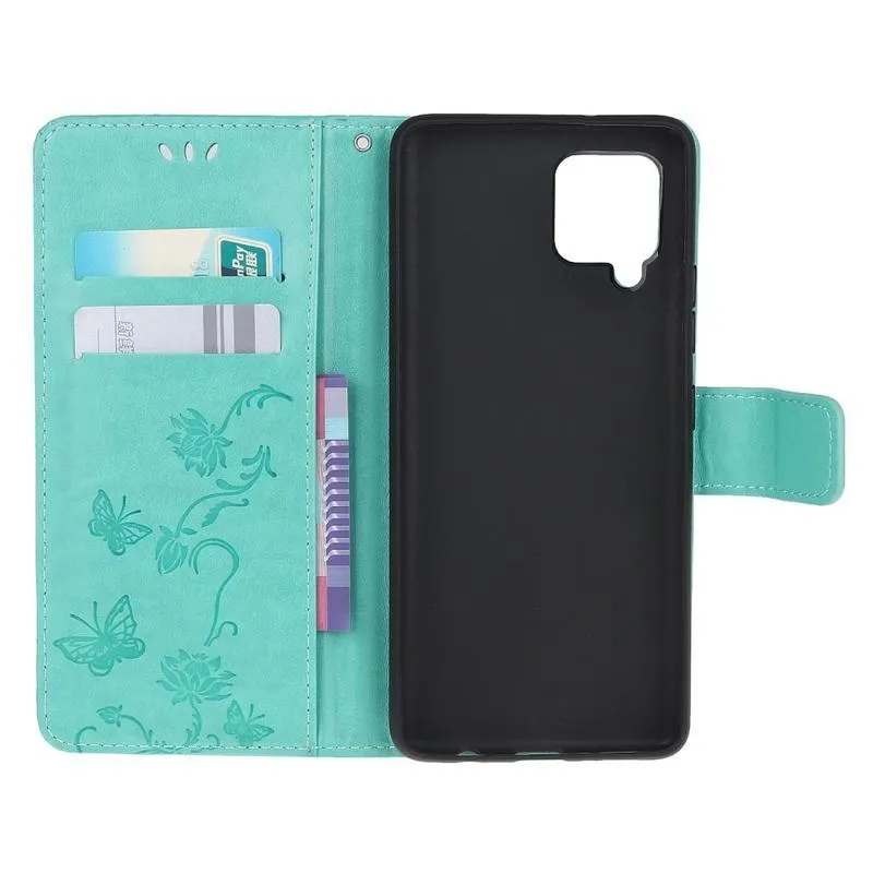 Virág PU bőr pénztárca tok Samsung Galaxy A12/M12 - cián színű