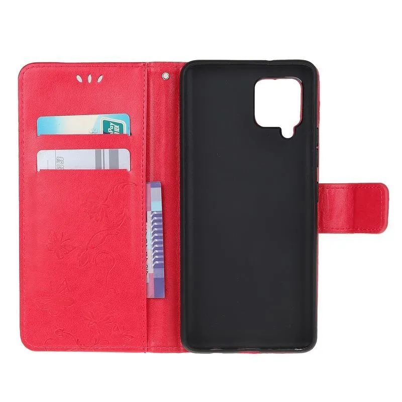 Virág PU bőr pénztárca tok Samsung Galaxy A12/M12 készülékhez - piros