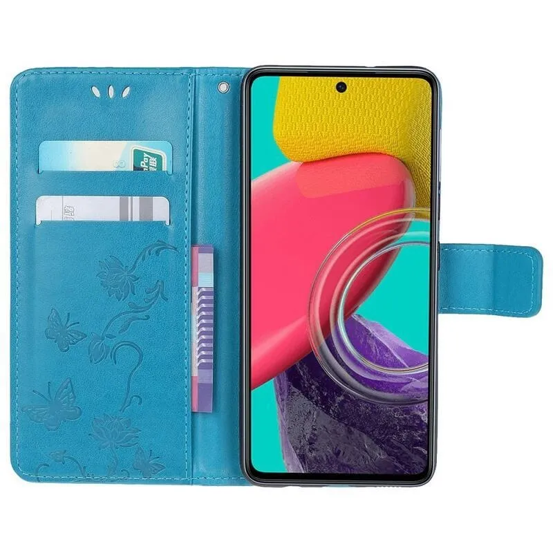 Virág PU bőr pénztárca tok Samsung Galaxy M53 5G-hez - kék