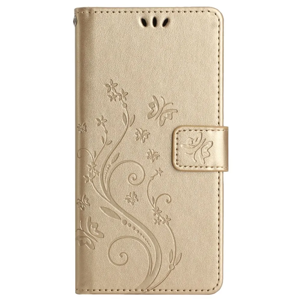 • Elegáns műbőr arany színben, finom virág- és pillangómintával.