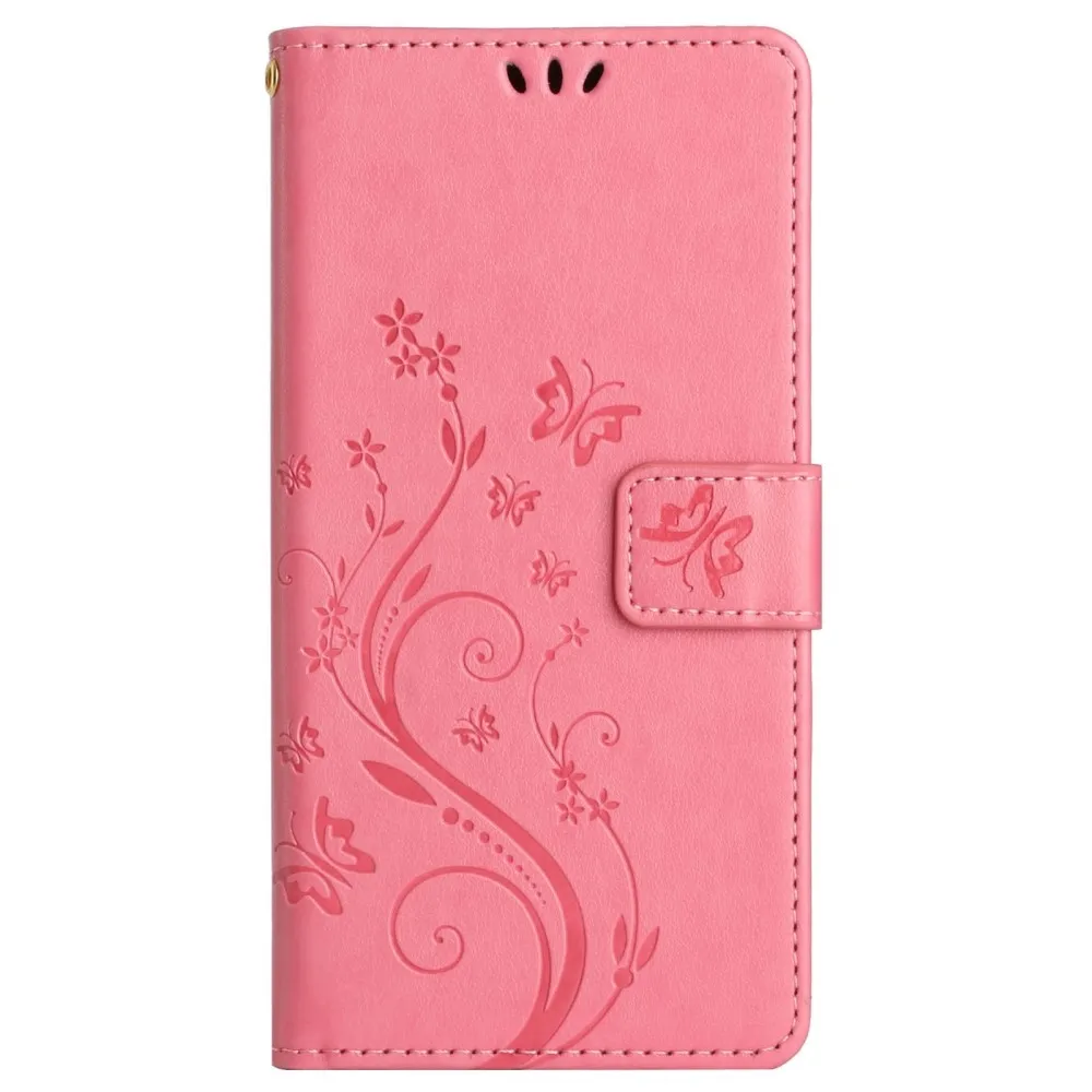 • Elegáns műbőr rózsaszín színben, finom virág- és pillangómintával.