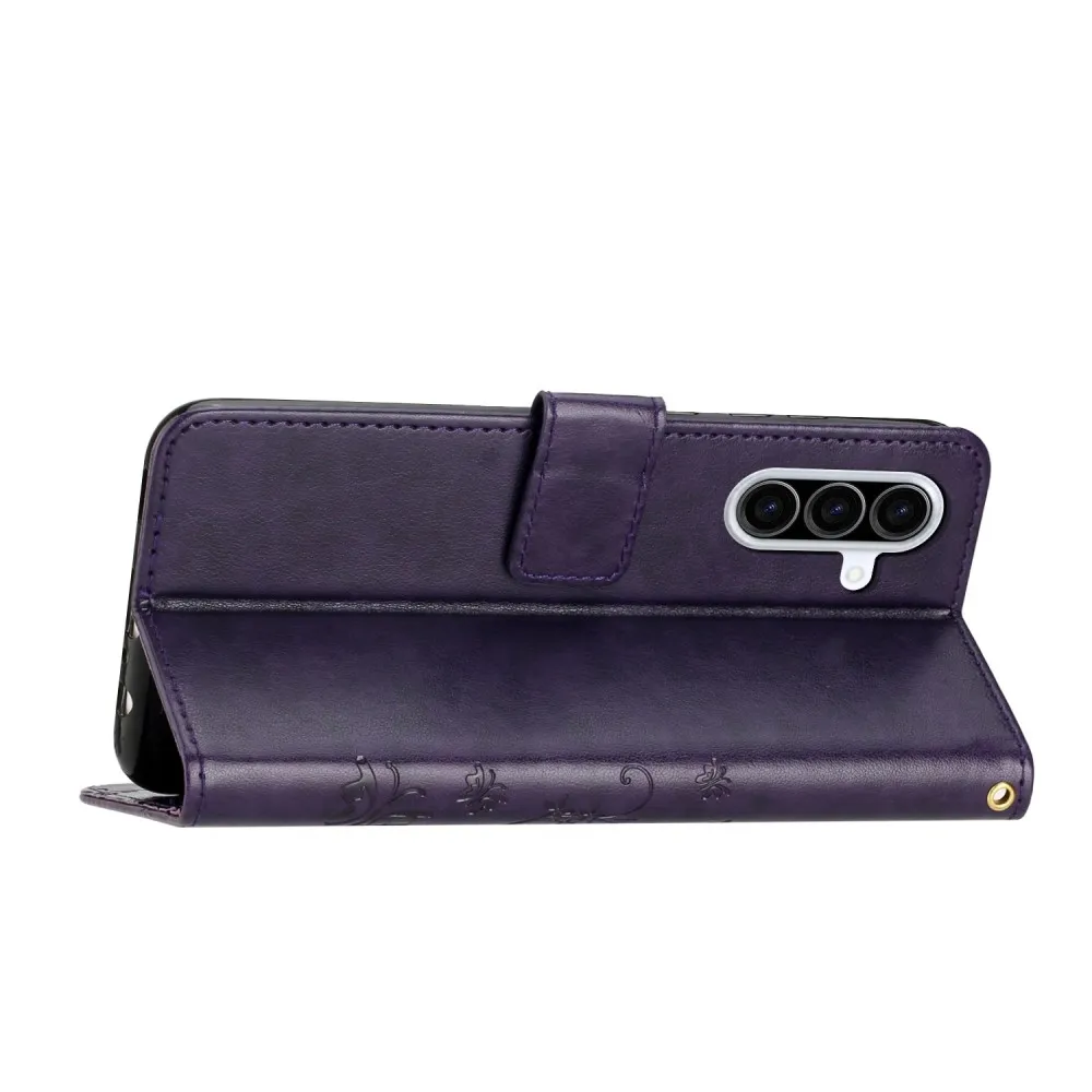 Sötét lila virágok pénztárca tok Samsung Galaxy A36 5G-hez