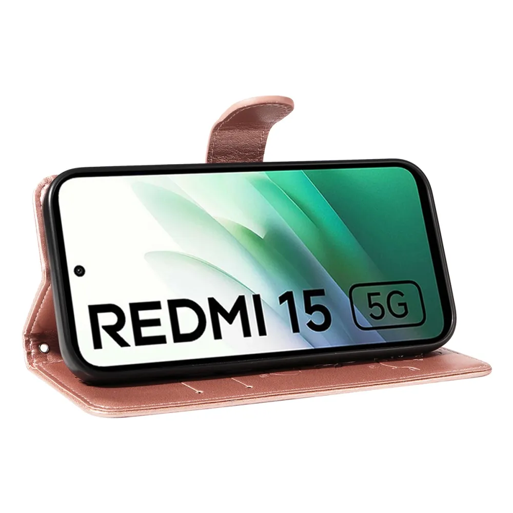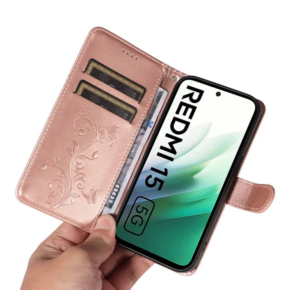 Rózsa arany pénztárca tok Virágok a Xiaomi Redmi 15 5G (169mm) számára