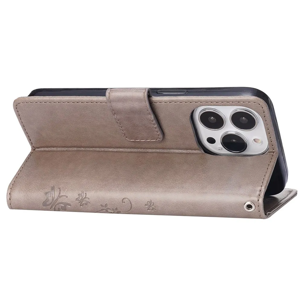 Szürke virágos pénztárca tok iPhone 15 Pro készülékhez