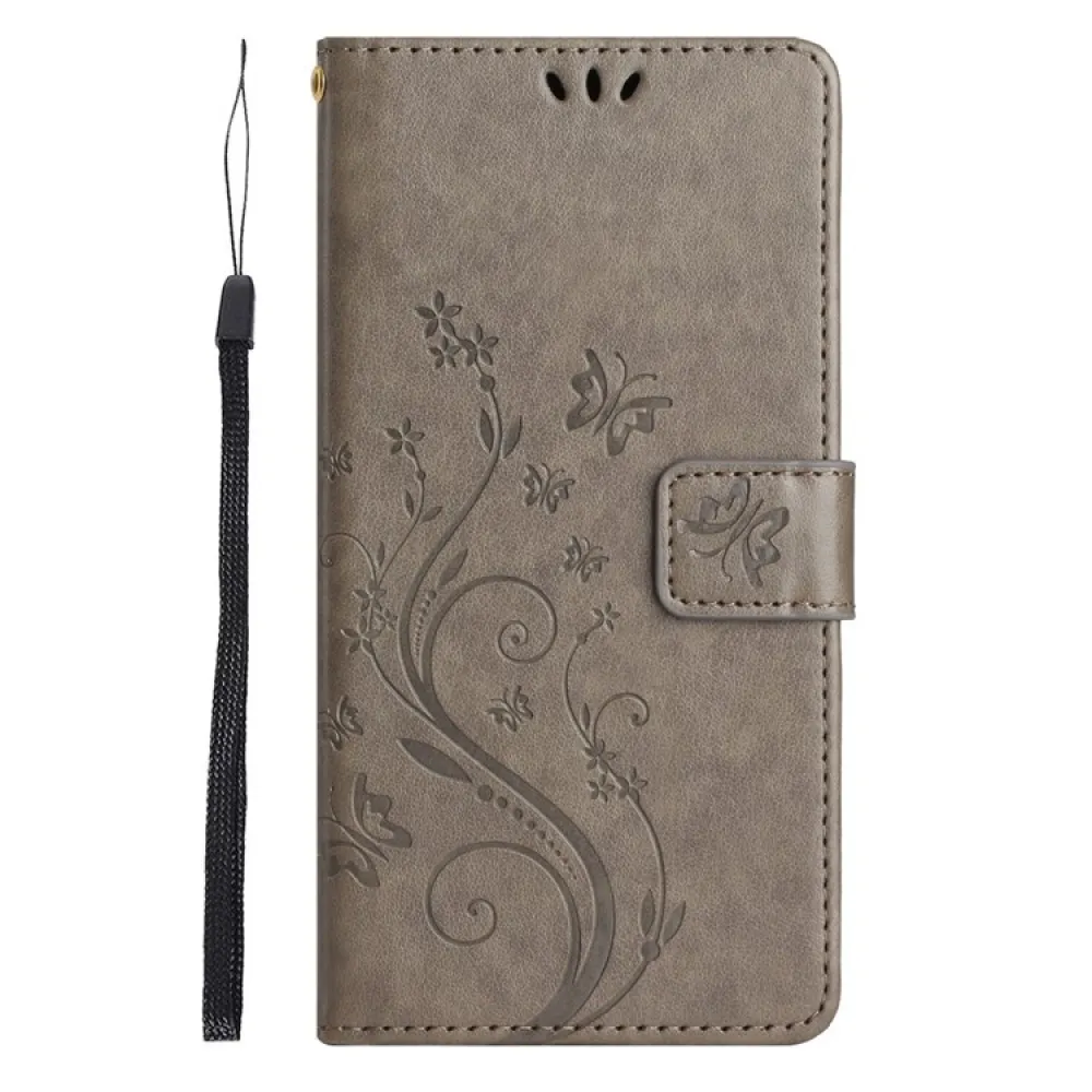 • Elegáns műbőr szürke színben, finom virág- és pillangómintával.