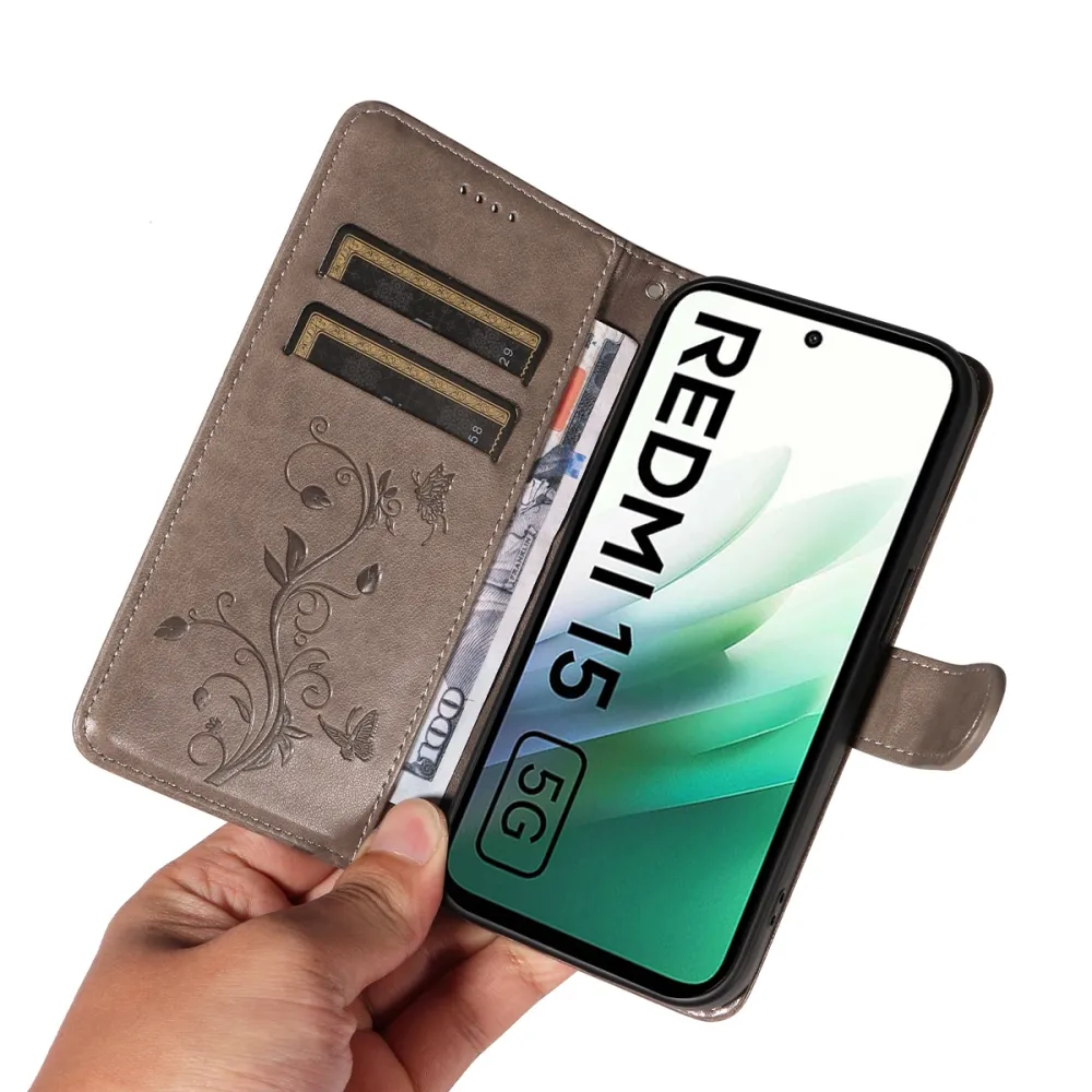 Szürke pénztárca tok Virágos a Xiaomi Redmi 15 4G (171mm) számára