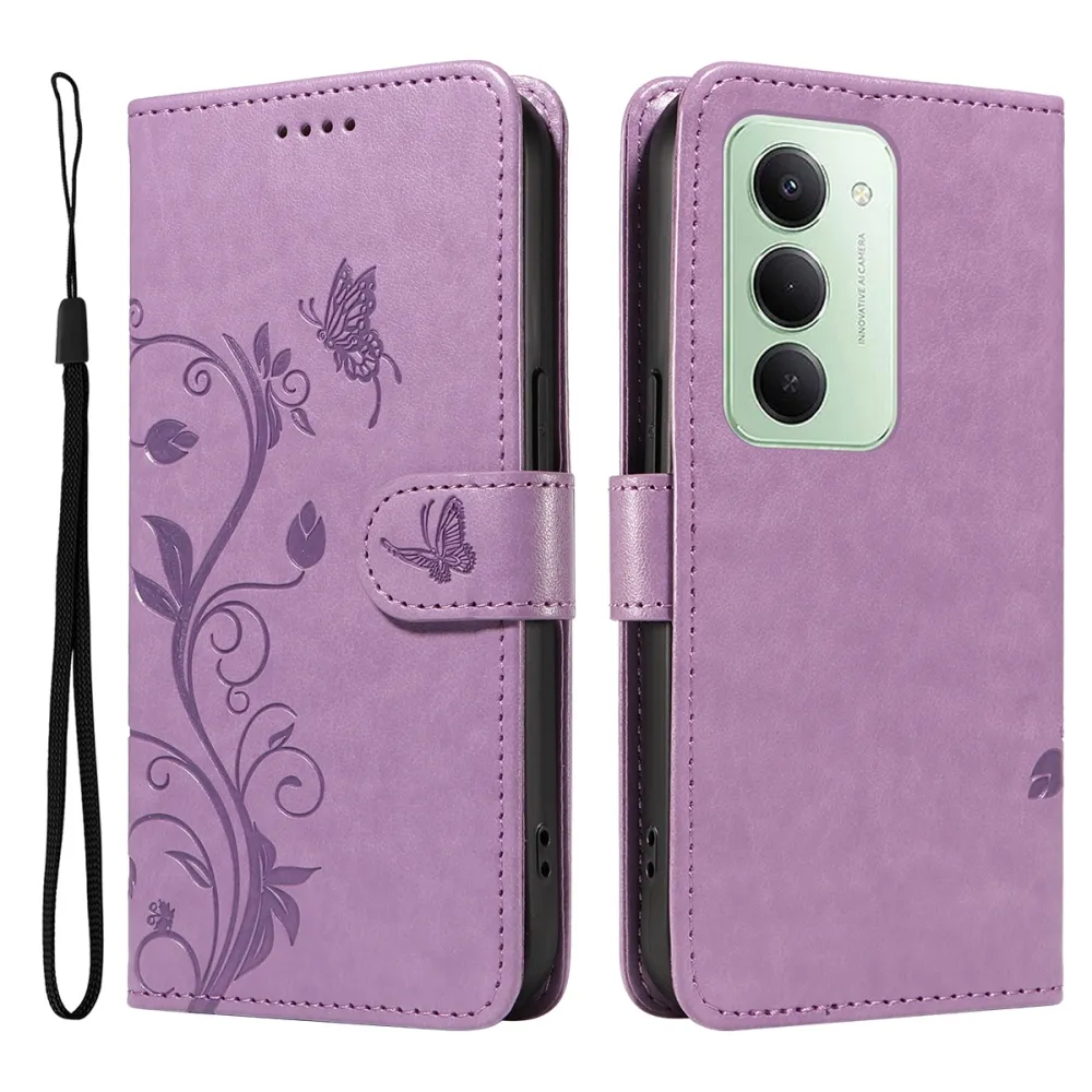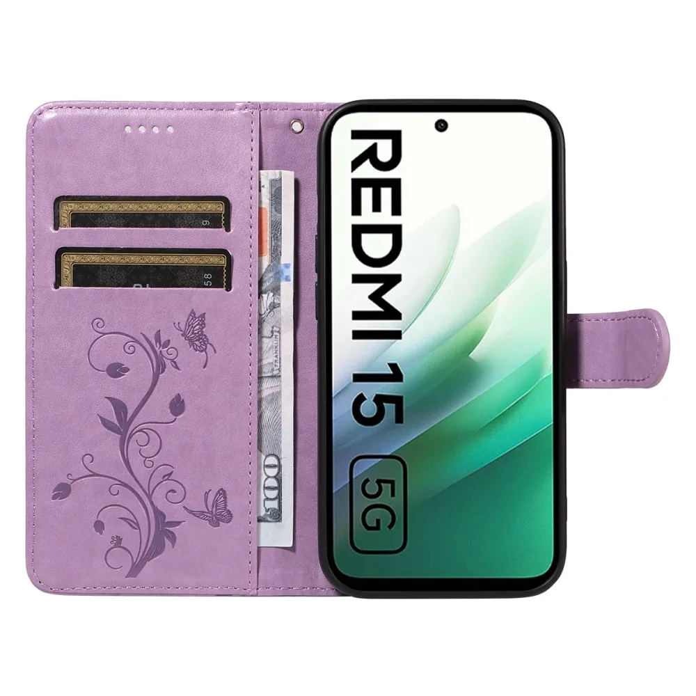 Világos lila pénztárca tok Virágos a Xiaomi Redmi 15 4G (171mm) számára