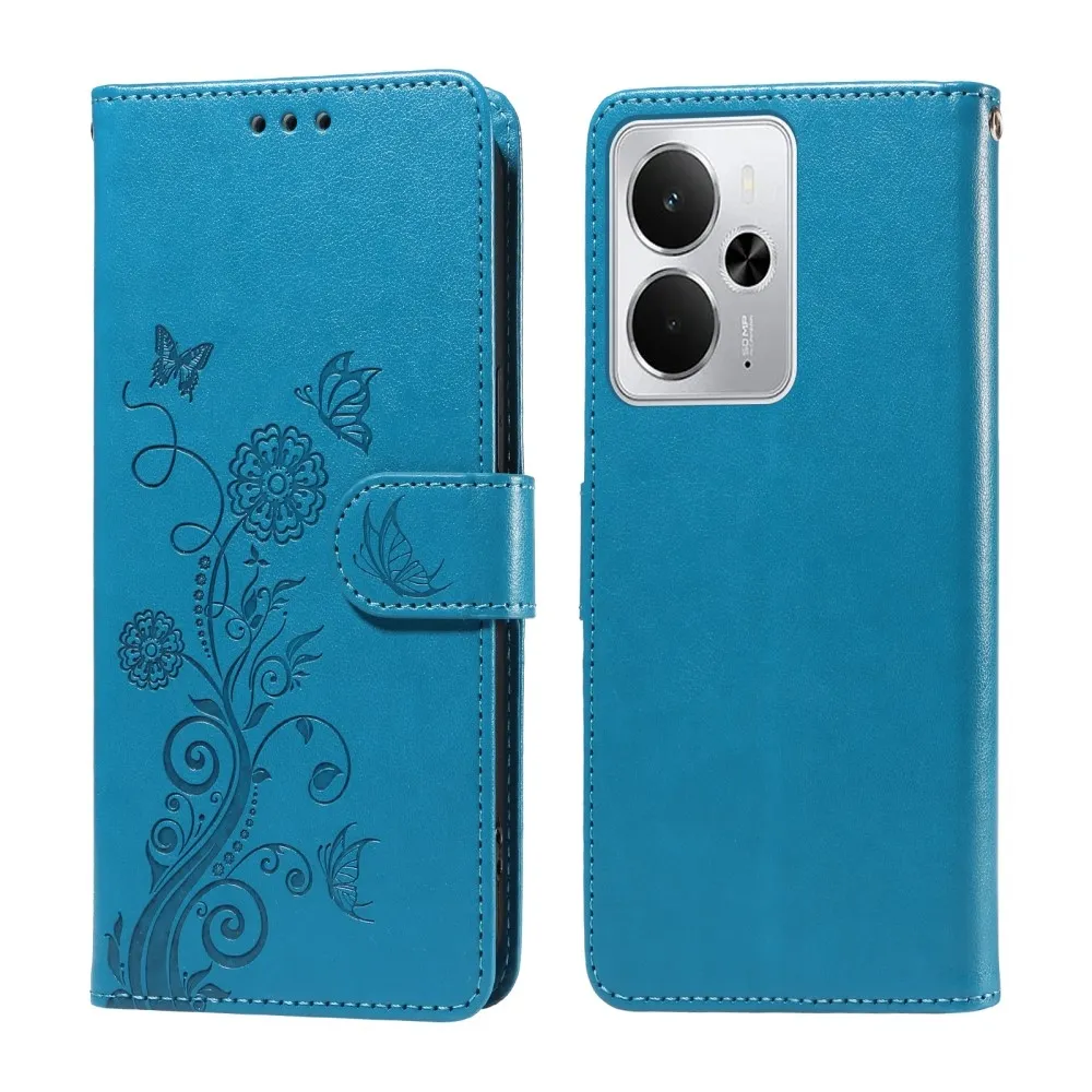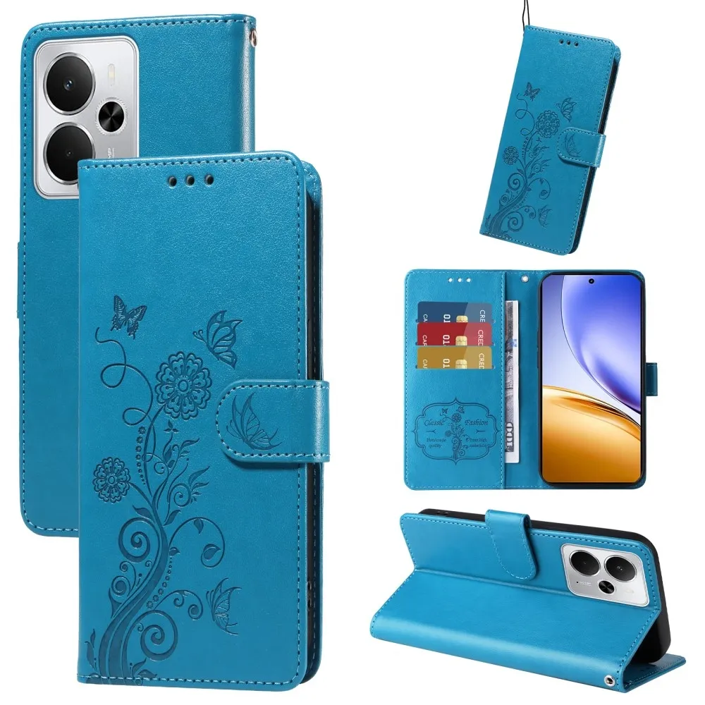 Kék pénztárca tok Virágos a Realme 14 5G számára