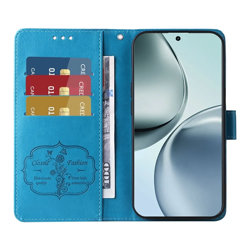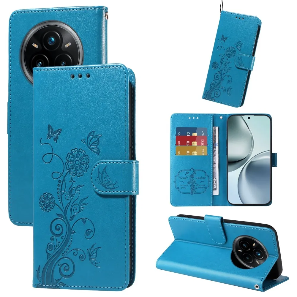 Kék pénztárca tok Virágos a Realme 14 Pro+ 5G számára