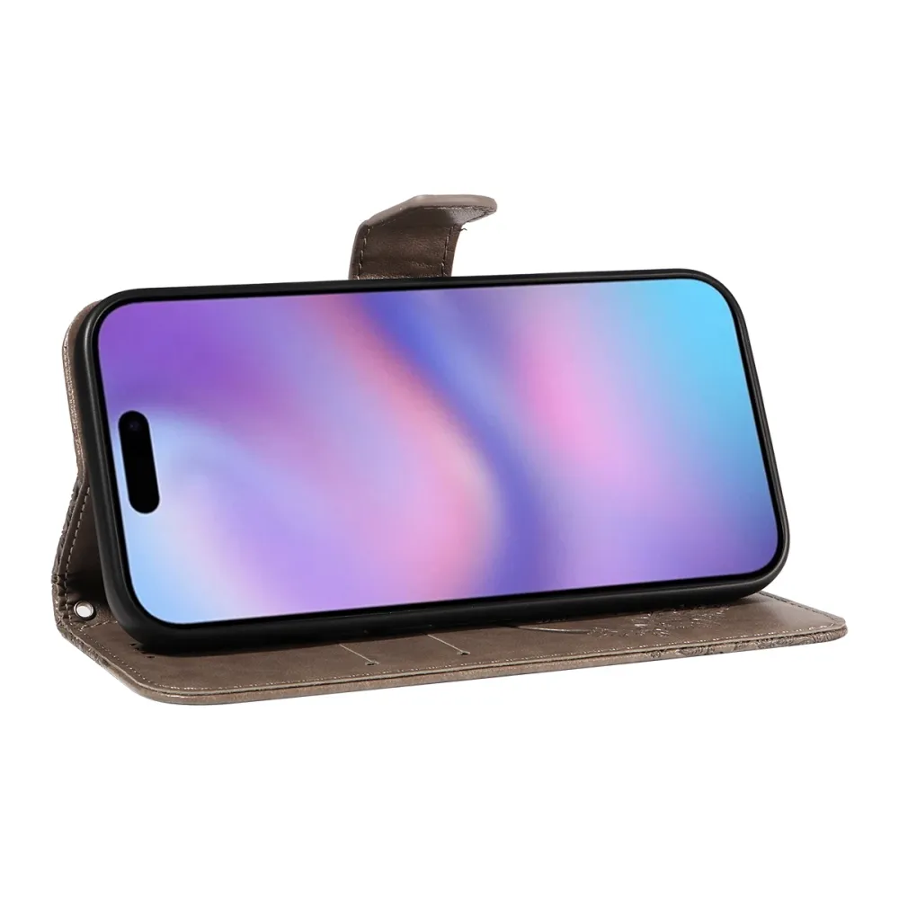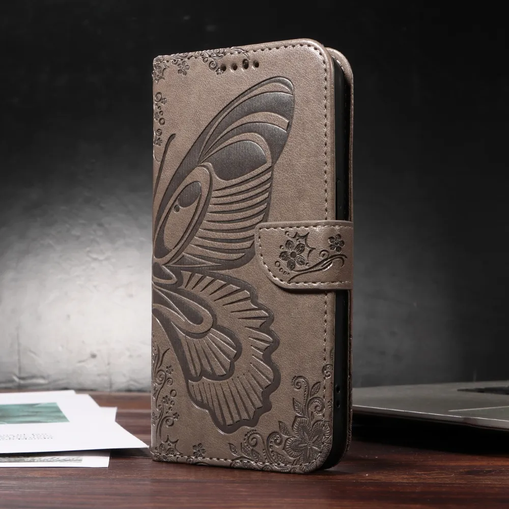 Szürke pénztárca tok Virágos pillangó iPhone 17-hez
