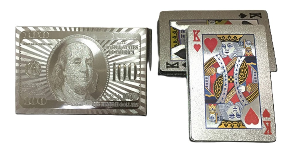 Kártyák száma: 54 db Anyag: műanyag Kivitel: ezüst 100 dolláros motívum Tulajdonságok: vízálló, mosható
