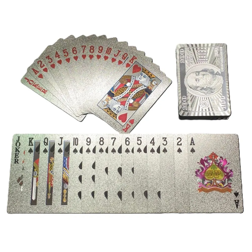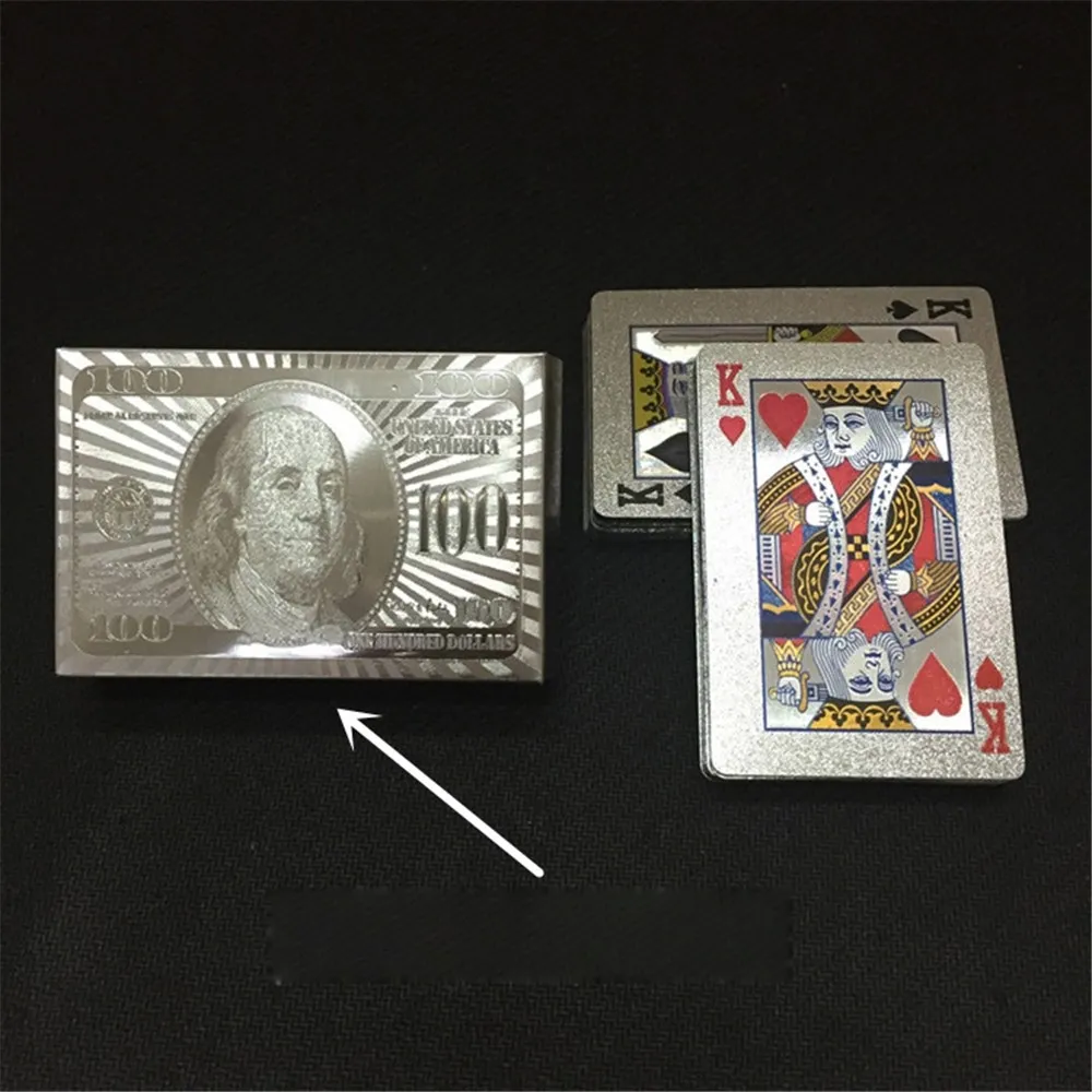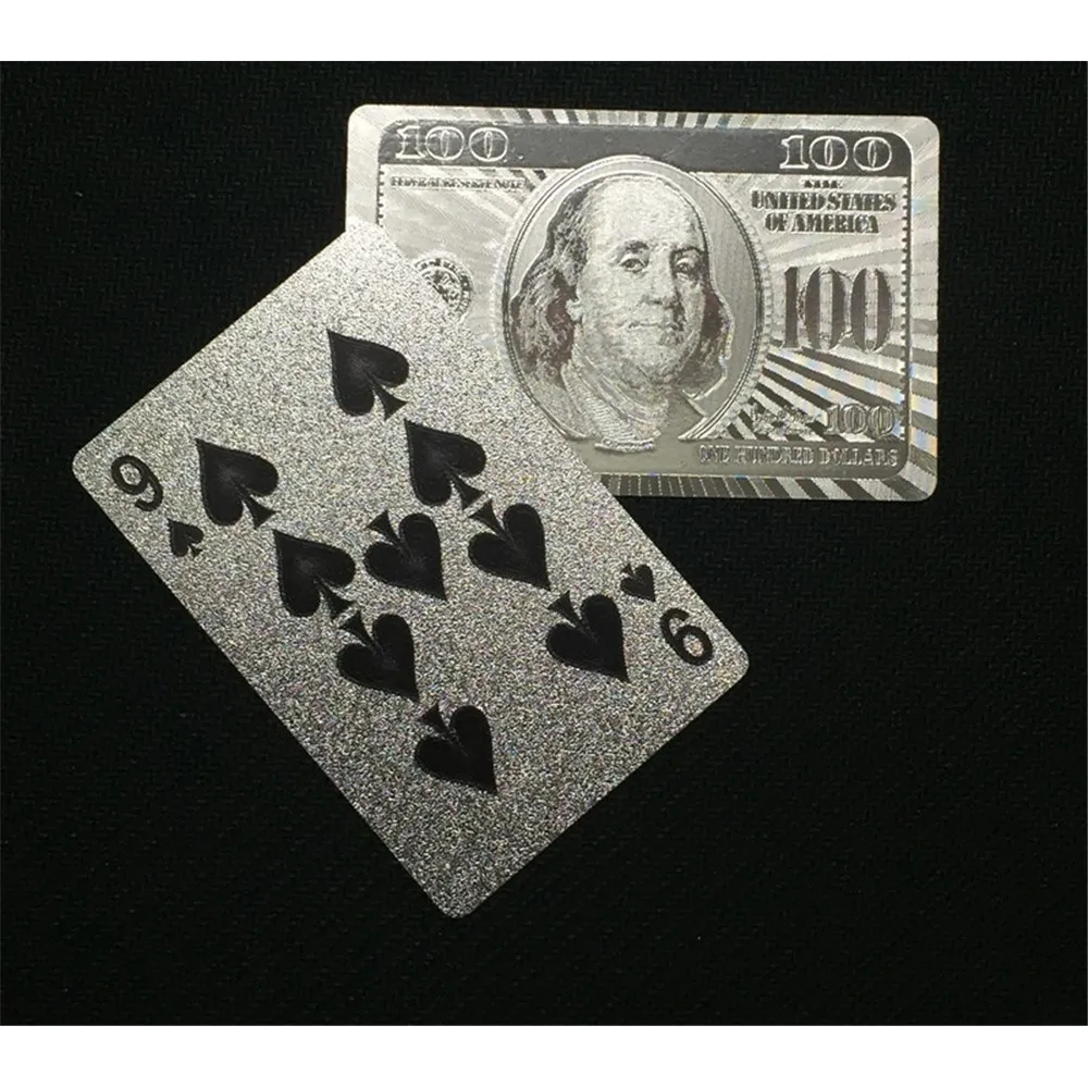 Vízálló műanyag játékkártya 100 dolláros ezüst kivitelben 54 db stílusos és eredeti kártyacsomag luxus dizájnnal, amely a 100 dolláros bankjegy motívumát idézi. Az ezüst megjelenés exkluzív hatást kölcsönöz, amely feldobja az otthoni kártyapartit, a pókerestet vagy a baráti összejöveteleket.