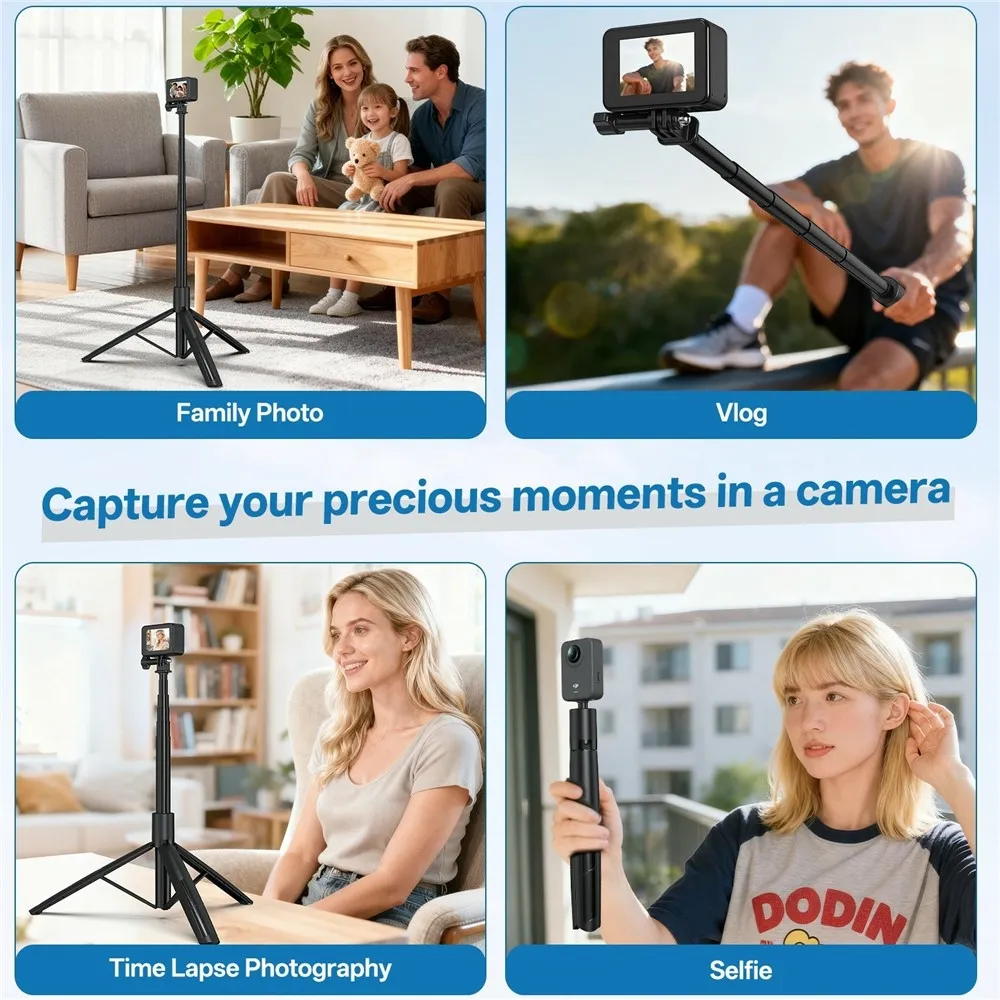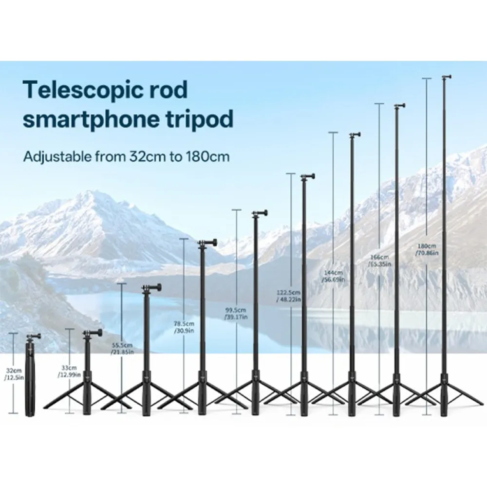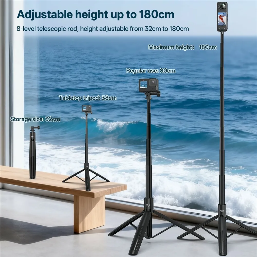A VRIG TP-30 teleszkópos állvány akciókamerákhoz és mobiltelefonokhoz készült, stabil felvételkészítést biztosít beltéren és kültéren egyaránt. A magasság 180 cm-ig állítható, így alkalmas vlogoláshoz, panoráma felvételekhez és csoportképekhez. A szelfibot és állvány kombinációja rugalmas használatot tesz lehetővé további kiegészítők nélkül.